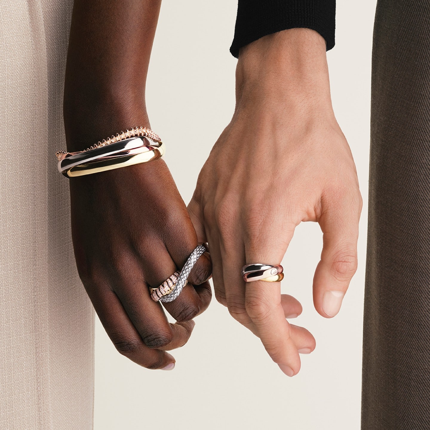 Su diseño puro, unisex e inconfundible le permitió evolucionar en todos los sentidos: engastada con diamantes, en versión anillo, tamaño pequeño o mediano, en colgante, de oro blanco, multiplicada por dos o más y en versión flexible.