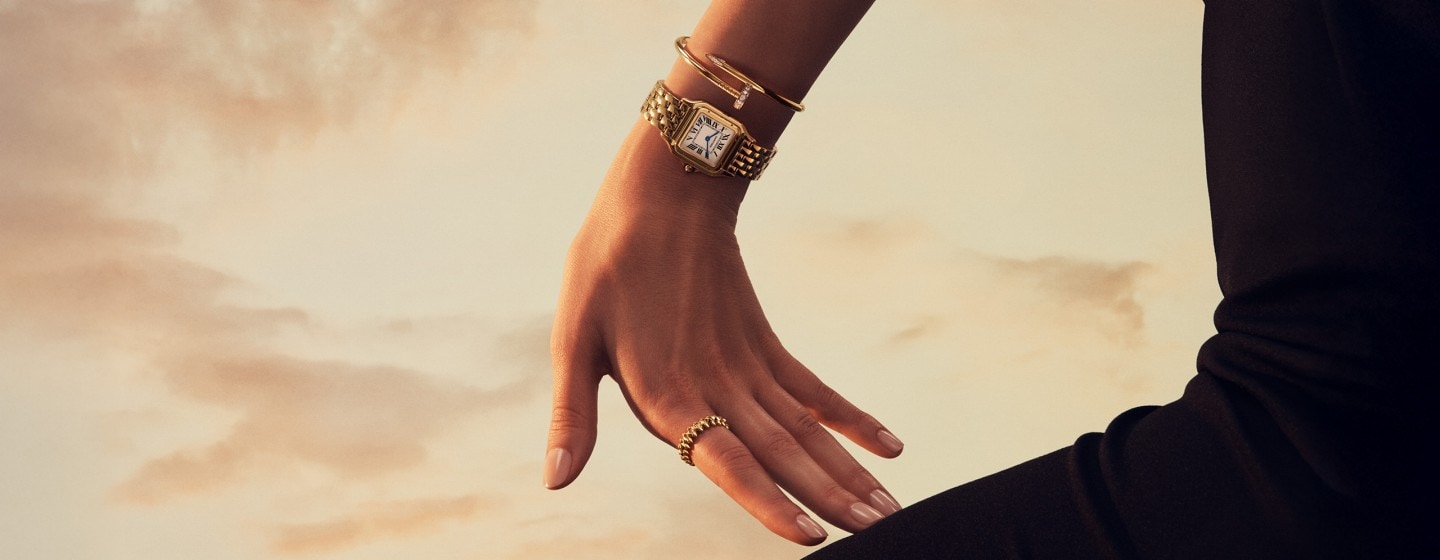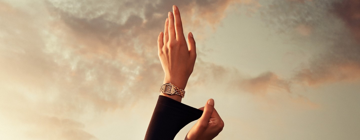 El llamativo reloj Panthère presenta variantes de joyería en oro rosa o amarillo con esferas que multiplican el efecto. Graneadas, con efecto rayos de sol, satinadas o engastadas con diamantes, las esferas captan la luz y multiplican el aura preciosa del reloj.