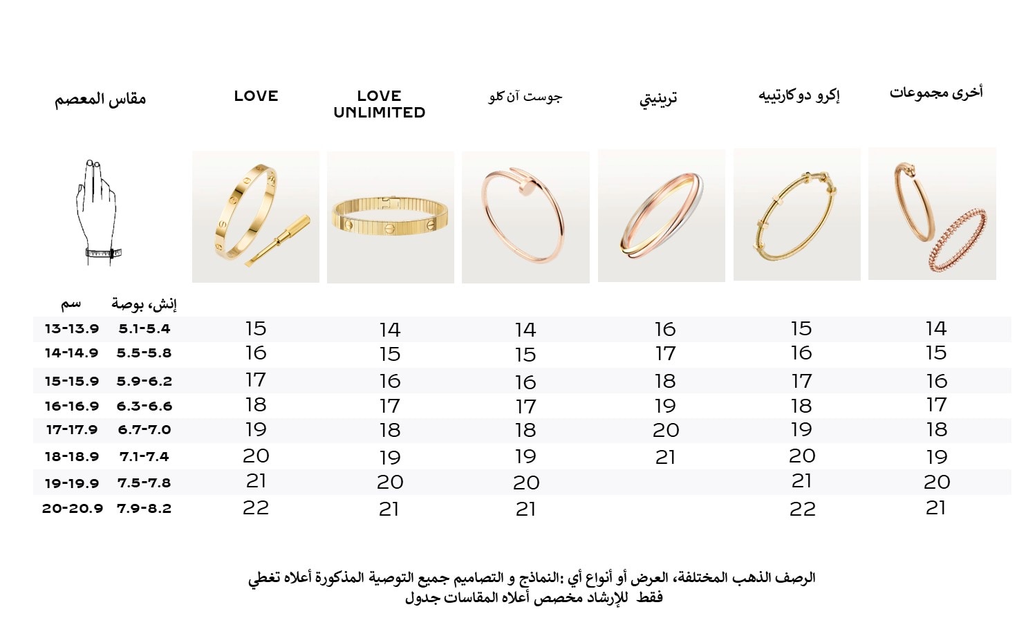 قد تختلف توصيات المقاسات حسب مجموعاتنا. اكتشف كافة مقاسات الأساور في جدول مقاساتنا:
