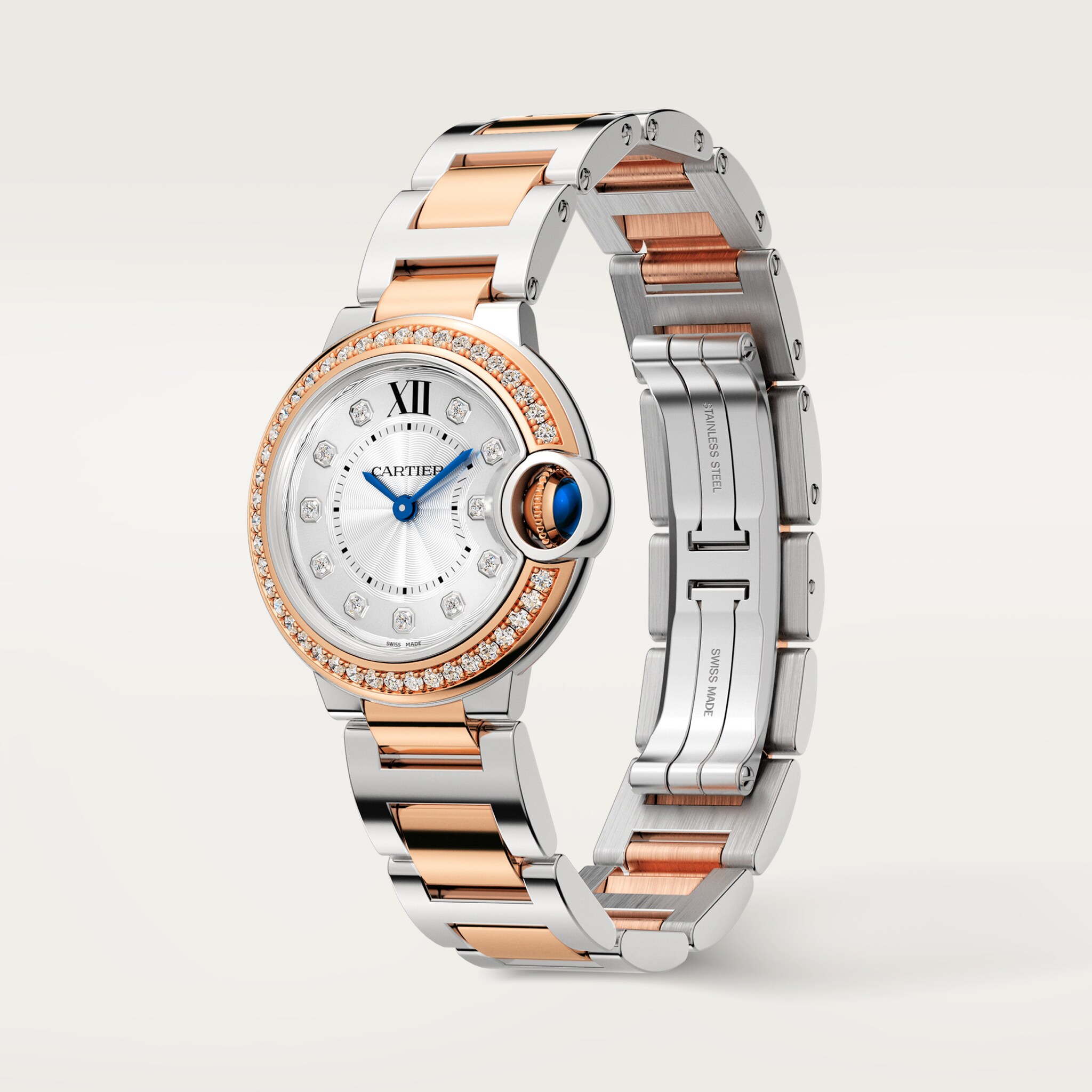 ساعة "بالون بلو دو كارتييه"، 33 مم، تعمل بآلية حركة ميكانيكية ذاتية التعبئة. علبة الساعة مصنوعة من الفولاذ، والتاج مسنّن مصنوع من الذهب الوردي 750/1000 ومرصّع بكابوشون من الإسبينل الصناعي. الإطار الخارجي مصنوع من الذهب الوردي 750/1000 والمينا فضّي مزيّن بنقش غيوشيه، ومرصّعان بـ 61 ماسة بقطع بريانت الحديث البرّاق تزن معًا 0.63 قيراط. العقارب مصمّمة على شكل سيف من الفولاذ المطلي باللون الأزرق. كريستال الساعة من الياقوت الأزرق. سوار ثنائي اللون قابل للتبديل. السماكة: 10.49 مم. مقاومة للماء حتى عمق 3 بار (حوالي 30 مترًا).