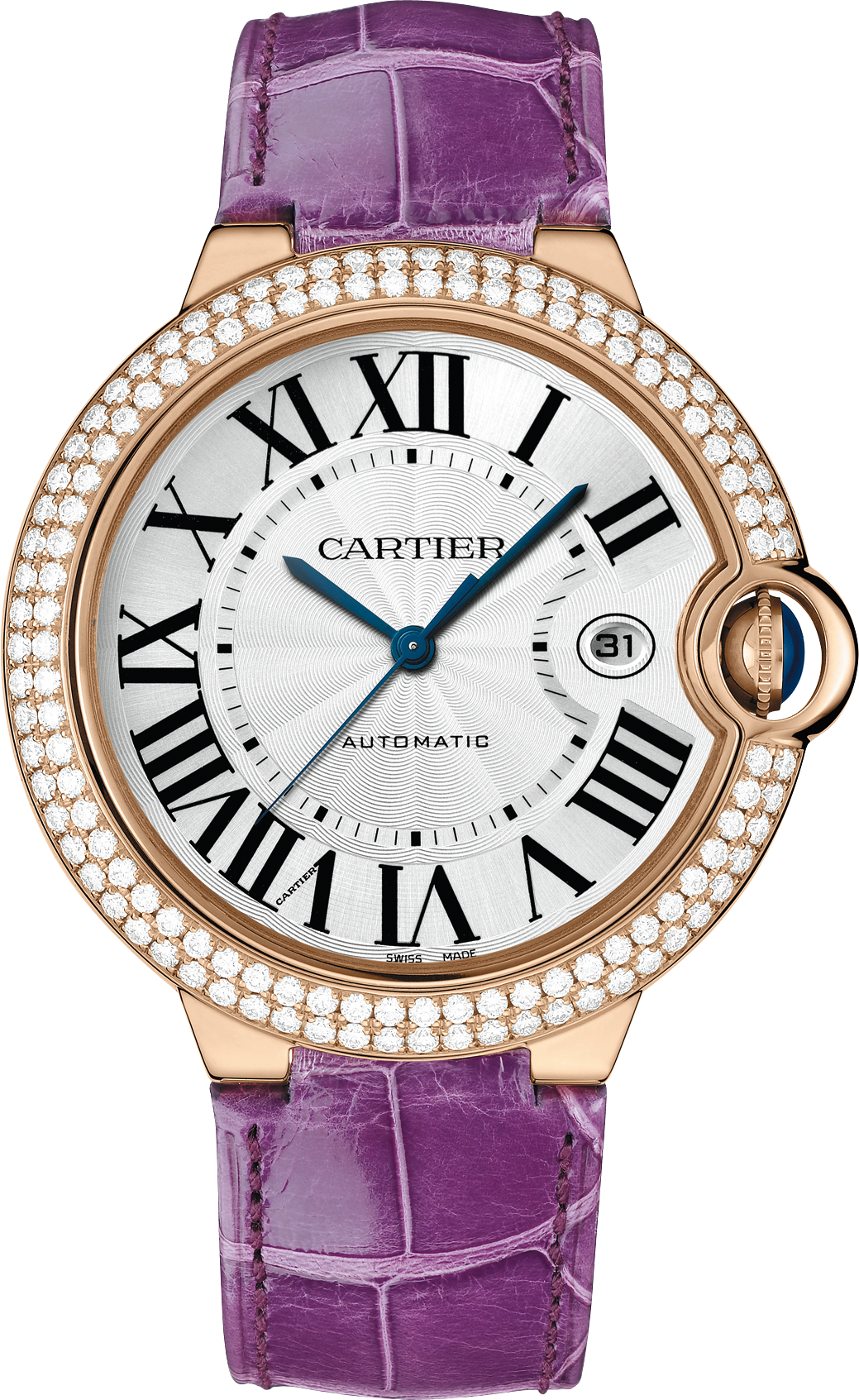 ساعة من مجموعة "بالون بلو دو كارتييه"، 33 مم، تعمل بآلية حركة ميكانيكية ذاتية التعبئة. علبة الساعة والتاج مصنوعان من الذهب الوردي 750/1000 ومرصّعان بـ 115 ماسة بقطع بريانت الحديث البرّاق تزن معًا 0.94 قيراط. التاج مسنّن ومرصّع بكابوشون من الياقوت الأزرق. مينا الساعة فضّي شبيه بلون الأوبال ومزيّن بنقش غيوشيه ومطلي باللّكر. العقارب مصمّمة على شكل سيف من الفولاذ المطلي باللون الأزرق. كريستال الساعة من الياقوت الأزرق. الحزام مصنوع من جلد التمساح باللون الأرجواني، ومزوَّد بإبزيم مزدوج قابل للطي والتعديل مصنوع من الذهب الوردي 750/1000، مقاسه 14 مم. مقاييس العلبة: القطر: 33 مم. السماكة: 10.16 مم. مقاومة للماء حتى عمق 3 بار (حوالي 30 مترًا).