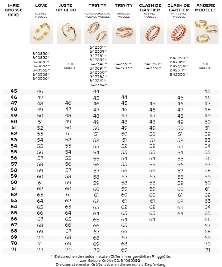 Die Größen unserer Cartier Kreationen können von Kollektion zu Kollektion variieren. Alle Empfehlungen finden Sie in der untenstehenden Tabelle.