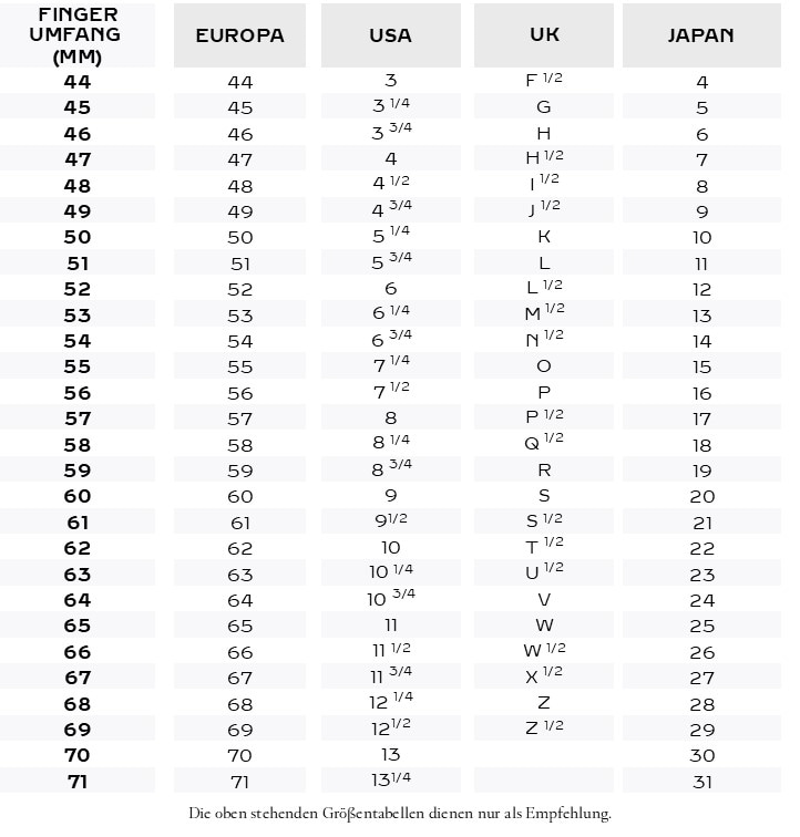 Der Fingerumfang kann im Laufe des Tages leicht variieren. Möglicherweise müssen Sie den Ring öfter anprobieren, um sicherzustellen, dass er bequem sitzt. Denken Sie auch daran, dass der Finger an der rechten Hand eine andere Größe haben kann als der gleiche Finger an der linken Hand.