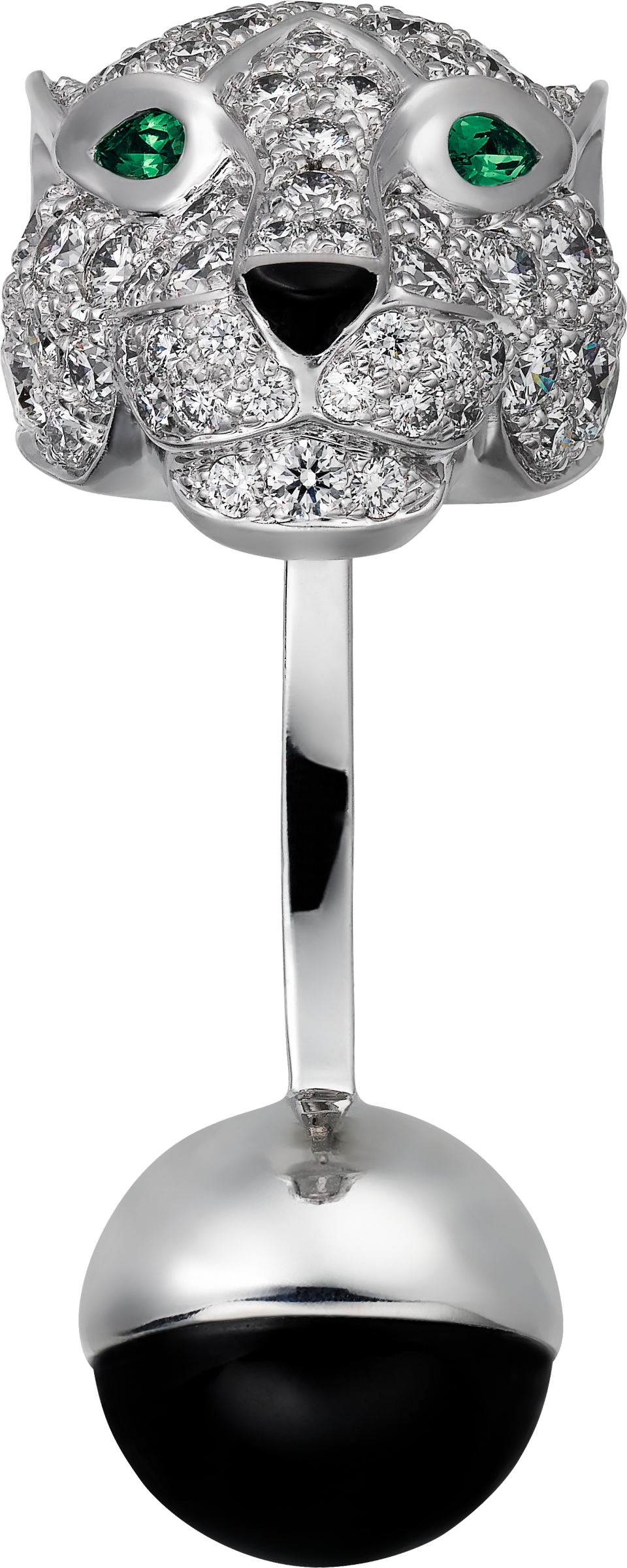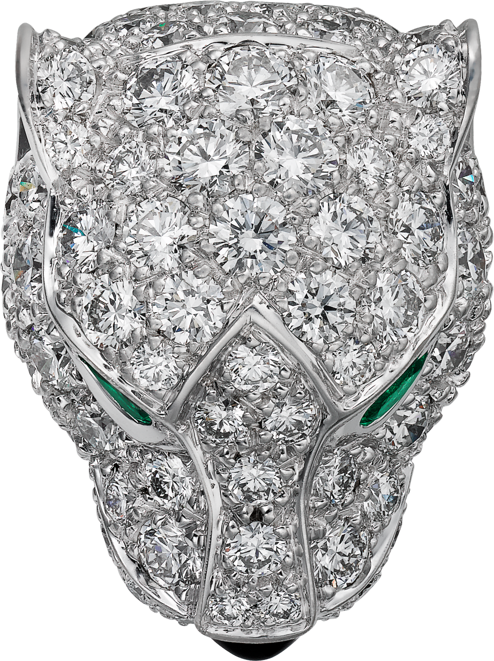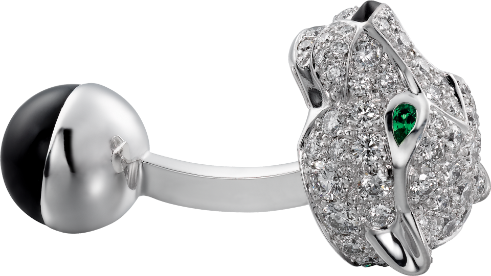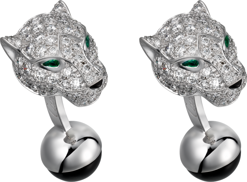 Panthère de Cartier cufflinks in rhodiumized 18K solid gold paved with diamonds, 2 emerald eyes, black lacquer nose, half bead in black onyx. Dimensions: 9 x 12 x 15 mm