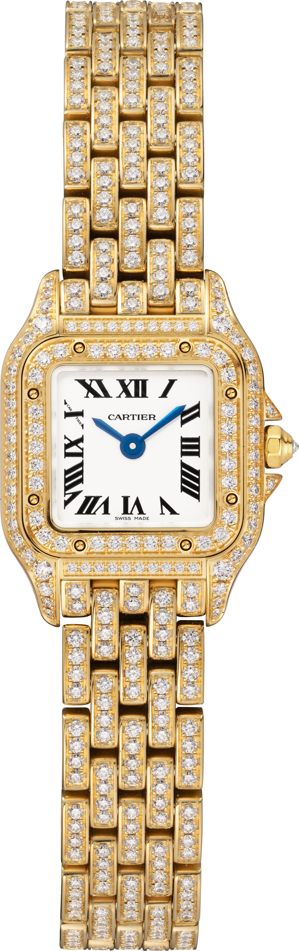 Panthère de Cartier watch, mini model, quartz movement. Case, octagonal crown and bracelet in 18K yellow gold with 599 brilliant-cut diamonds totaling 3.62 carats. Silvered dial, blued-steel sword-shaped hands, sapphire crystal. Dimensions: 25 mm x 20 mm, thickness: 6 mm. Water-resistant up to 3 bar (approx. 30 meters/100 feet). Non-contractual photo (the length of the watch strap may vary slightly).