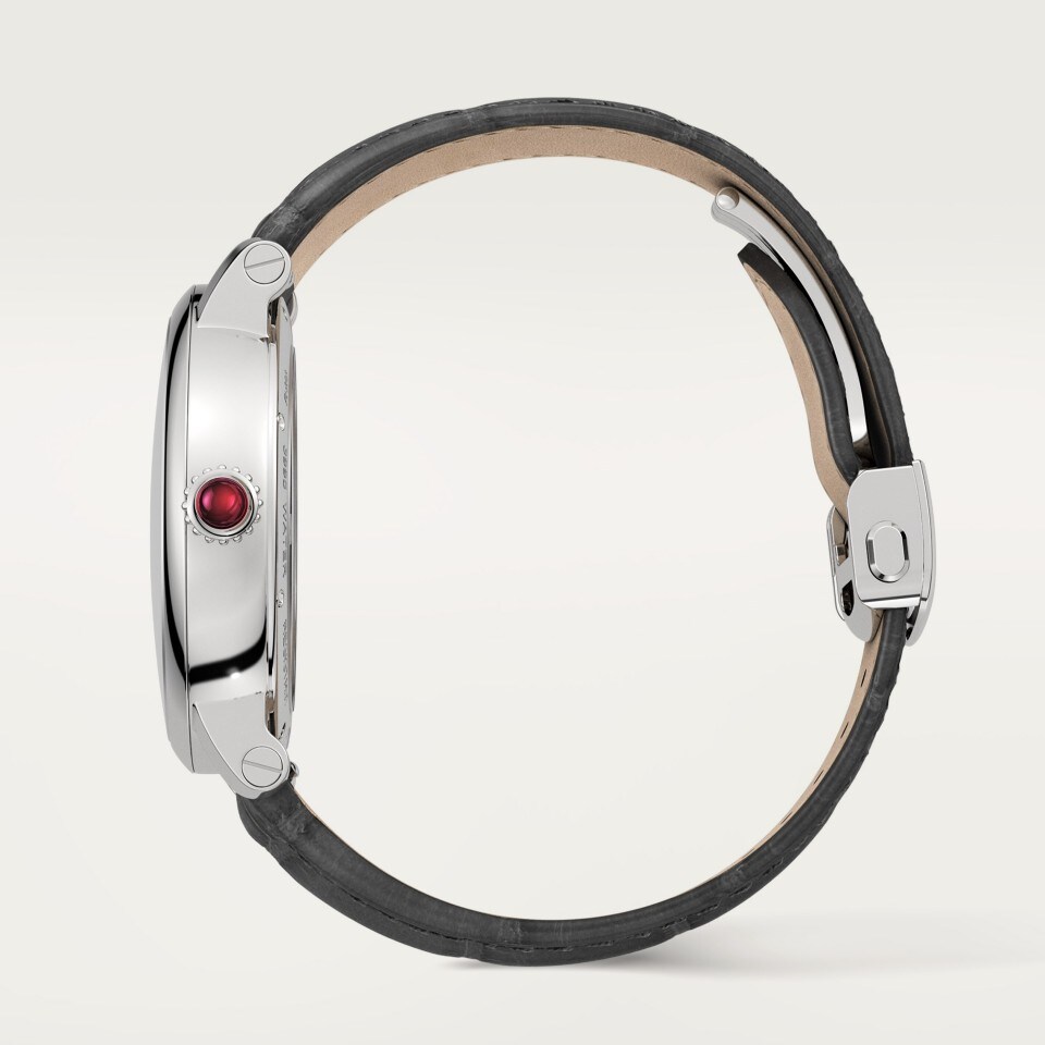 Platinum (950/1000) case, platinum (950/1000) beaded crown set with a ruby, platinum (950/1000) dial, sword-shaped hands in polished gray steel, sapphire crystal and case back.
