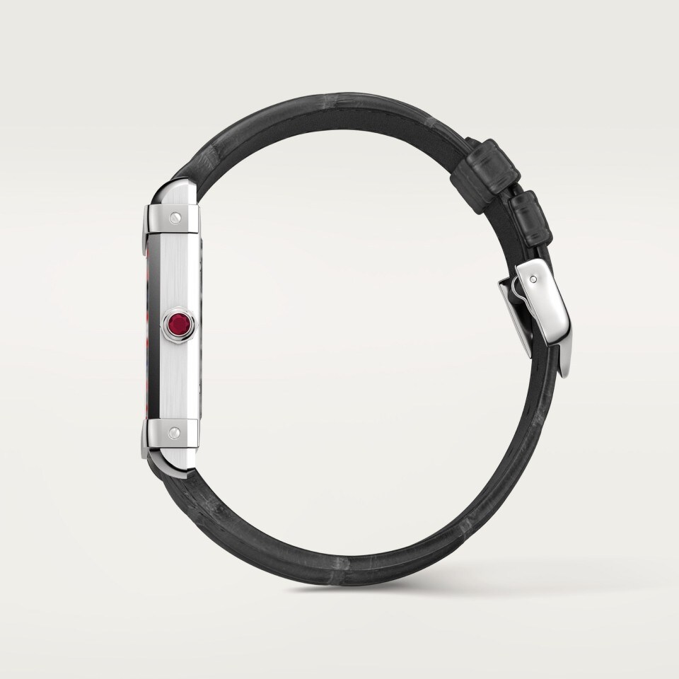 Platinum 950/1000 case, crown in platinum 950/1000 set with a ruby, sword-shaped hands in polished gray steel, sapphire crystal and case back.