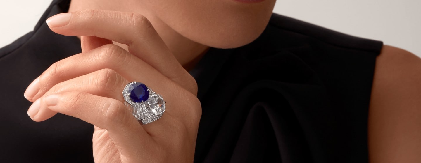 This ring combines two rare gems: a 5.59-carat sapphire from Kashmir and a 5.01-carat D IF diamond, both round. The alternating lines of brilliant- and baguette-cut diamonds create a dynamic and graphic architecture. The layered construction multiplies its sparkling reflections.
