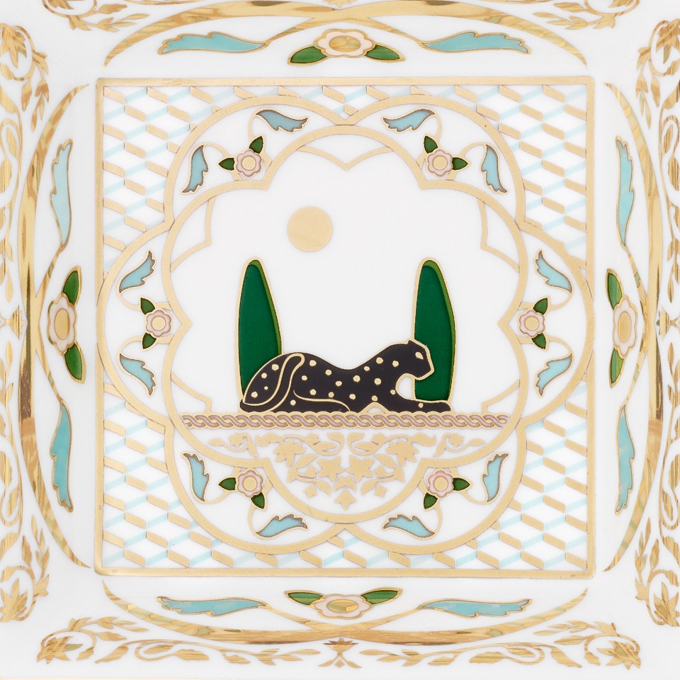 Set of two Panthère de Cartier trinket trays, small model, in Limoges porcelain with arabesques motif and goat suede base. Dimensions: W 8 cm x L 8 cm x H 2 cm
