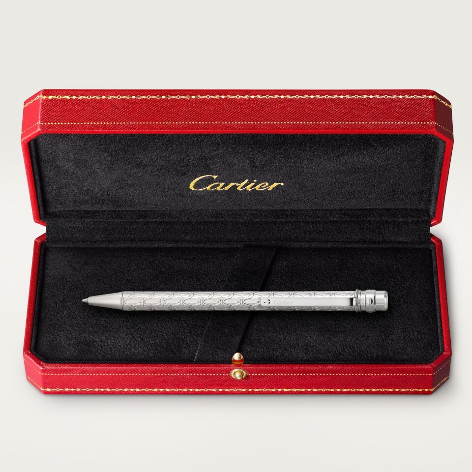 Santos de Cartier ballpoint pen, small model, palladium-finish C de Cartier motif metal body, palladium-finish screw and details. Dimensions: 125 x 8 mm. Accompanied by a ballpoint pen cartridge, black ink, medium size.