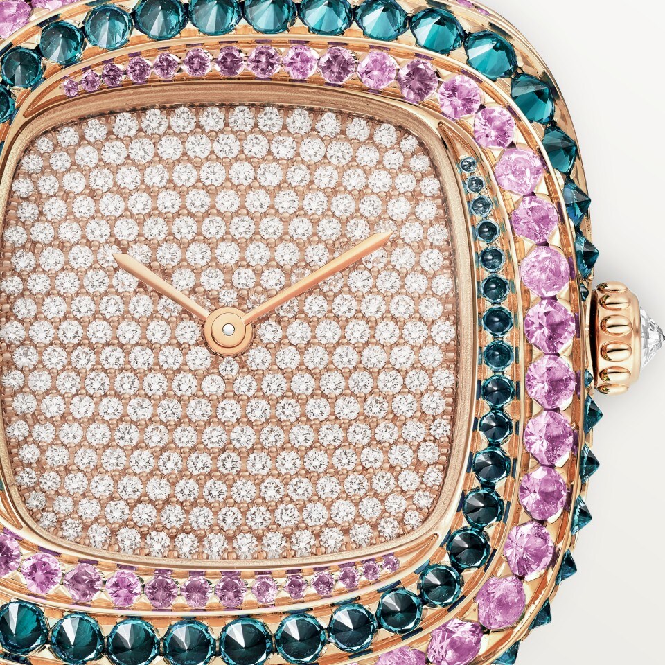 Coussin de Cartier watch, medium model, quartz movement. 18K rose gold (750/1000) case set with tourmalines and pink sapphires, golden-finish steel sword-shaped hands. 18K rose gold (750/1000) dial and crown set with 259 brilliant-cut diamonds totaling 1.19 carat. Purple calfskin strap, 18K rose gold (750/1000) ardillon buckle set with 21 diamonds totaling 0.21 carats. Case dimensions: 30.4 mm x 31.1 mm. Thickness: 7.1 mm. Water-resistant up to 3 bar (approx. 30 meters/100 feet).