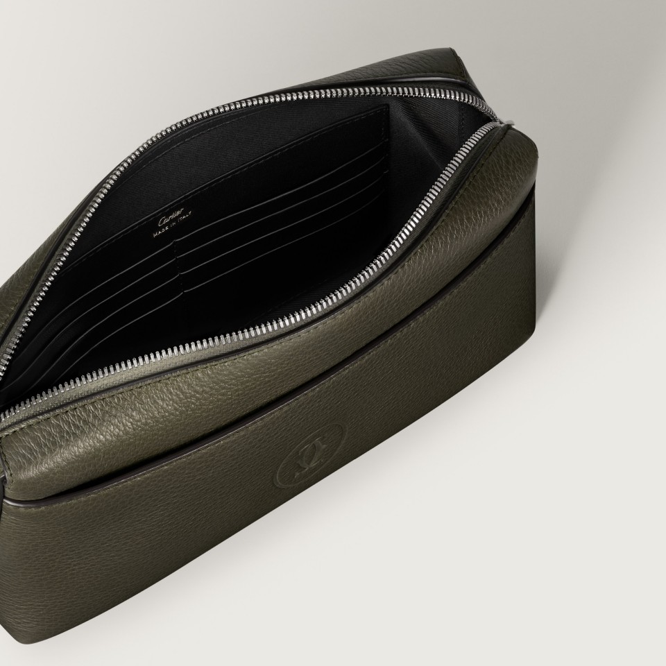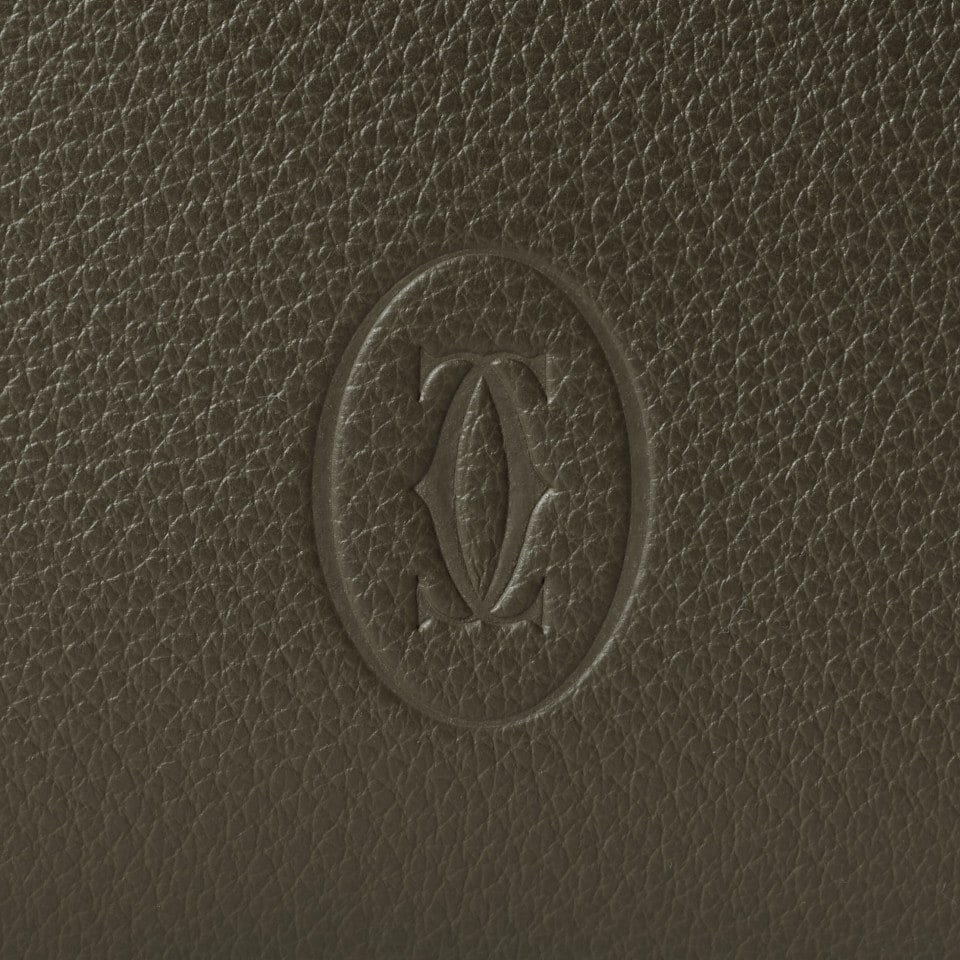 Must de Cartier khaki calfskin pouch. Zippered closure, palladium-finish metal parts. Exterior: embossed double C logo, one zippered pocket, detachable handle. Interior: black fabric lining, one flat pocket, eight credit card slots. Embossed silver-colored "Cartier" signature. Dimensions: height 160 mm x width 250 mm x depth 50 mm. Hand and wrist carry with detachable handle.