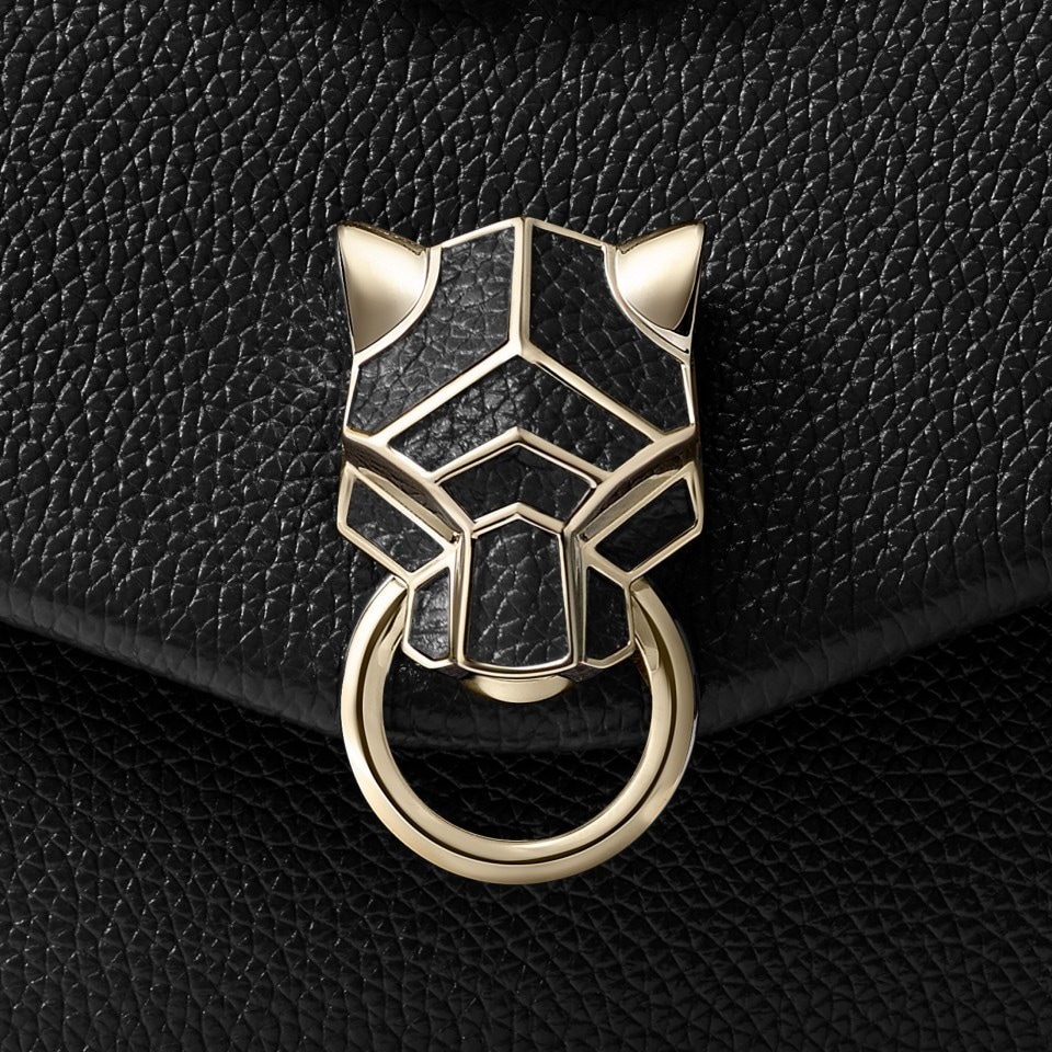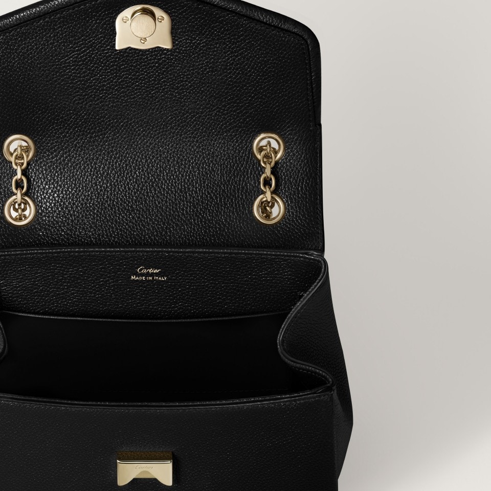 Panthère Graphique de Cartier mini model chain bag in black calfskin, golden-finish clasp, golden hot-stamped “Cartier” signature on the inside. One interior compartment, one flat pocket and one signature pocket with removable mirror. One pocket on the back. Lining: black lambskin. Dimensions: height 140 mm x length 200 mm x depth 85 mm. Shoulder and cross-body carry.