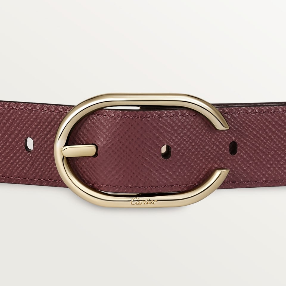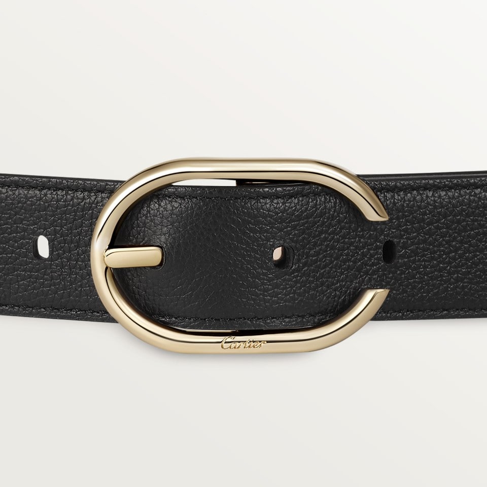 Capital C belt, golden-finish buckle, Cartier signature. Reversible strap in black and brown grained cowhide, embossed “Cartier” signature. Dimensions: width 30 mm x length 1230 mm. Adjustable.