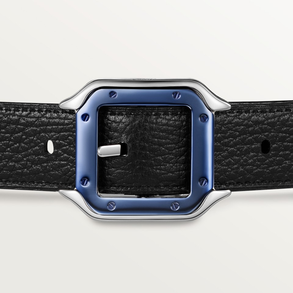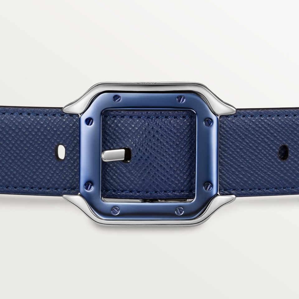 Belt with palladium and blue PVD-finish ardillon buckle, “Cartier” signature. Reversible strap in blue and black grained cowhide, embossed “Cartier” marking. Dimensions: width 30 mm x length 1230 mm. Adjustable.