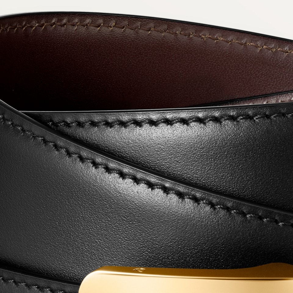 Belt with golden-finish ardillon buckle, Cartier signature. Reversible black and brown cowhide strap, embossed “Cartier” marking. Dimensions: 30 mm wide x 1,230 mm long. Adjustable.