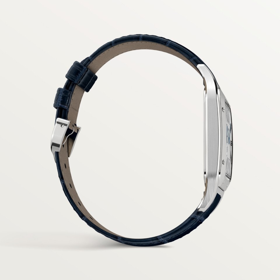 Santos-Dumont watch, extra-large model, Manufacture mechanical movement with manual winding, caliber 430 MC. Steel case, beaded steel crown set with a blue cabochon synthetic spinel, silver satin-finish dial with sunray-effect, Roman numerals, blued-steel sword-shaped hands, sapphire crystal. Navy blue alligator leather strap, steel ardillon buckle. Case dimensions: 46.6 mm x 33.9 mm, thickness: 7.5 mm. Water-resistant up to 3 bar (approx. 30 meters/100 feet).