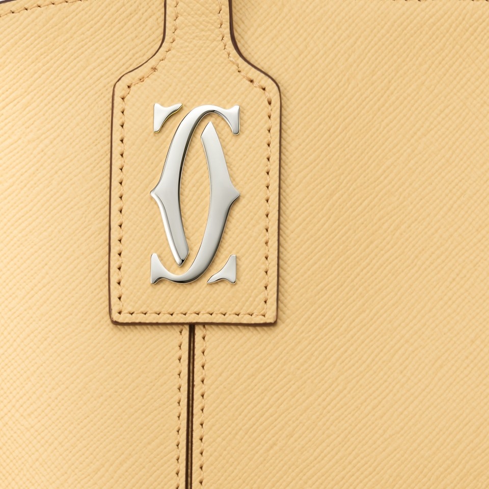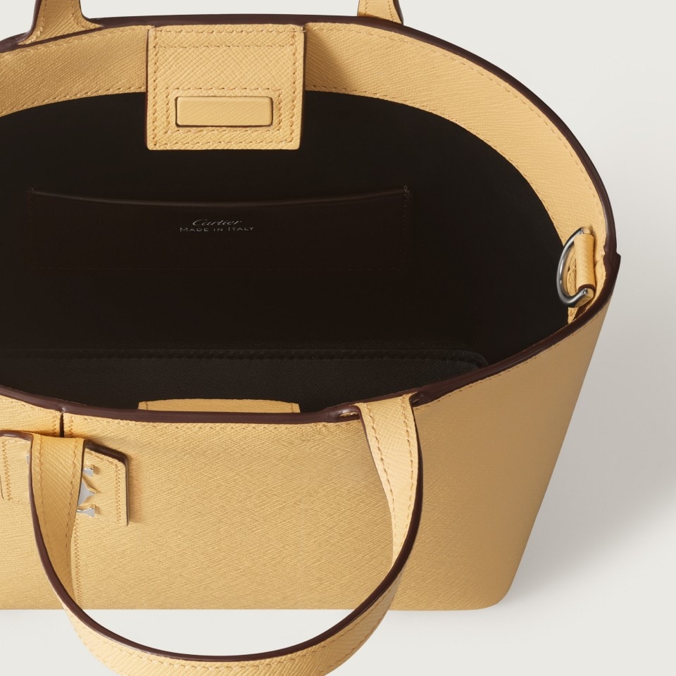 Mini tote bag in mimosa yellow textured calfskin, double C logo in palladium finish on strap, silver-colored "Cartier" hot-stamped signature on the inside. One interior compartment and one flat pocket. Lining: black lambskin. A shoulder strap in mimosa yellow embroidered fabric (width: 40 mm) and a mimosa yellow textured leather shoulder strap (width: 12 mm), both removable and adjustable for cross-body carry. Mimosa yellow textured calfskin handles for easy carrying. Customizable, detachable mimosa yellow textured leather patch on the back of the bag. Closing system with magnetic tab. Dimensions: length 250 mm x height 180 mm x depth 80 mm.