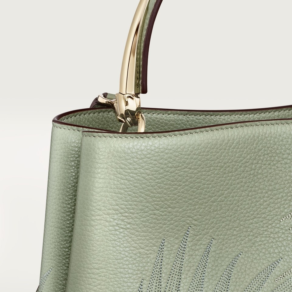 Small model handle bag in sage green grained calfskin and jungle embroidery, handle with golden-finish panther motif, golden hot-stamped “Cartier” signature on the inside. One interior compartment, one inner flat patch pocket and one removable zipped pocket in tone-on-tone grained calfskin. Magnetic closure on a mini leather flap. Adjustable and removable shoulder strap in sage green grained calfskin. Four protective metal feet. Lining: black lambskin. Dimensions: height 240 mm x length 190 mm x depth 110 mm. Hand and cross-body carry.