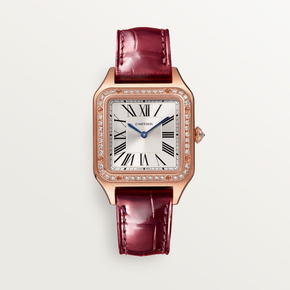 Santos-Dumont watch, small model, high autonomy quartz movement (~ 6 years). 18K rose gold (750/1000) case, beaded crown set with a cabochon-shaped sapphire, satin-brushed silver dial with sunray effect, Roman numerals, blued-steel sword-shaped hands, sapphire crystal. Strap in gray alligator leather, with 18K rose gold (750/1000) ardillon buckle. Case dimensions: 38 mm x 27.5 mm, thickness: 7.3 mm. Water-resistant up to 3 bar (approx. 30 meters/100 feet).