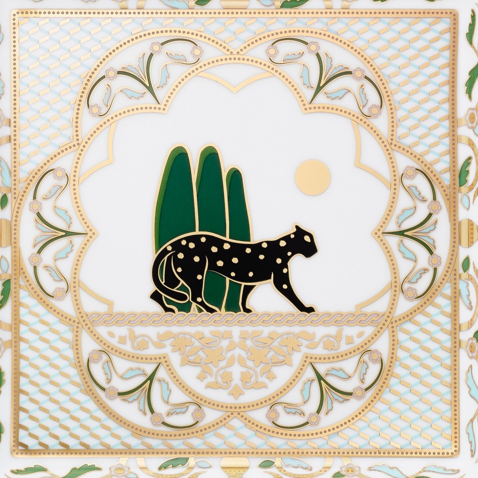 Panthère de Cartier trinket tray, medium model, in Limoges porcelain with arabesques motif, goat suede base. Dimensions: W 17 x L 17 x H 3 cm