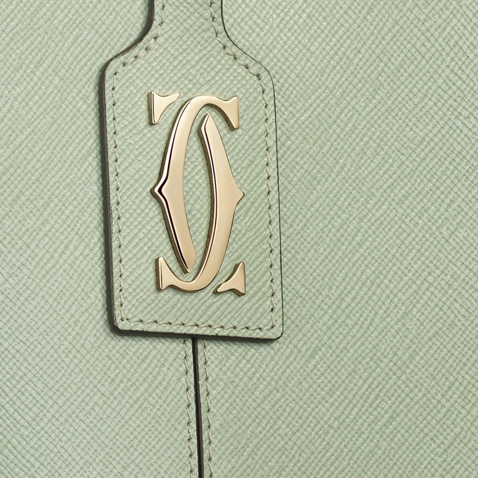 Mini tote bag, sage green textured calfskin, golden-finish double C logo on the strap, golden "Cartier" signature hot-stamped on the inside. One interior compartment and one flat pocket. Lining: black lambskin. One sage green embroidered fabric shoulder strap (Width: 40 mm) and one sage green textured leather shoulder strap (Width: 12 mm), both removable and adjustable for cross-body carry. Black textured calfskin handles for easy carrying. Customizable, detachable black textured leather patch on the back of the bag. Closing system with magnetic tab. Dimensions: Width: 250 mm. Height: 180 mm. Depth: 80 mm.