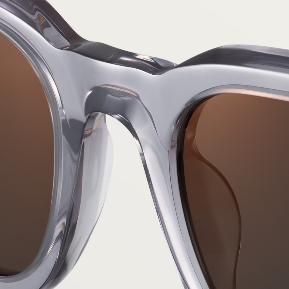 Première de Cartier sunglasses in gray acetate with details in metal with a smooth golden-finish on the temples, square shape and gray lenses with a golden mirror effect. Dimensions: 49 mm lenses, 23 mm bridge, 145 mm temples