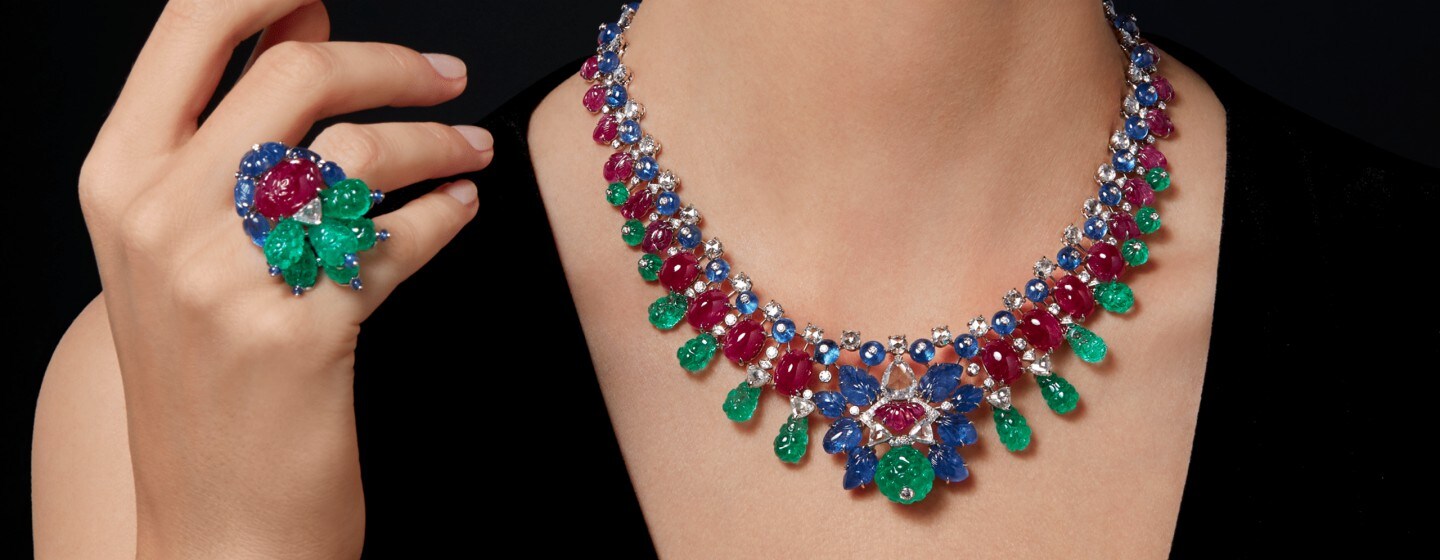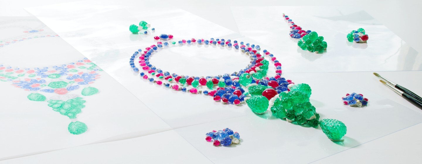 A 43.73-carat hexagonal-shaped emerald and two 86.96-carat emeralds sourced from Colombian mines set the tone. In addition to this, there is a "cluster” shape pendant, extremely rare in High Jewellery and composed of 19 gems. A daring construction with incredible thoroughness that has been designed to be worn in up to 8 different ways. Dazzling for the eyes as well as for the mind.