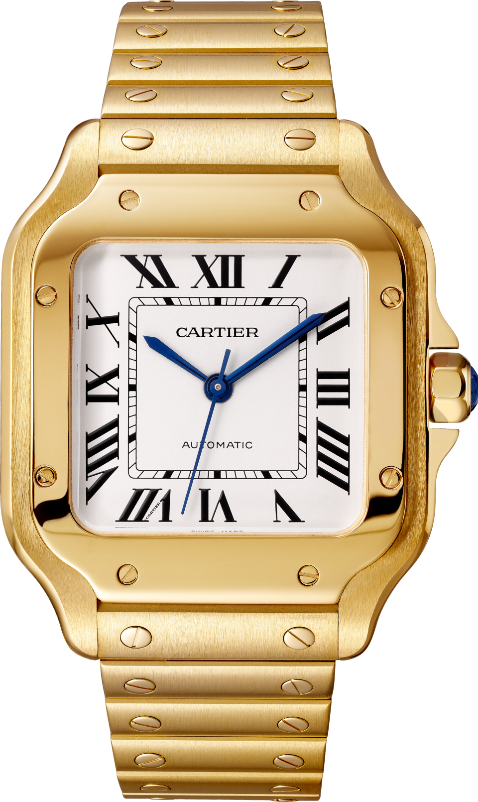 Santos watch, medium model, mechanical movement with automatic winding, caliber 1847 MC. 18K yellow gold (750/1000) case, 18K yellow gold (750/1000) seven-sided crown set with a faceted sapphire, silvered opaline dial, blued-steel sword-shaped hands, sapphire crystal. 18K yellow gold (750/1000) bracelet with "SmartLink" adjustment system. Second alligator skin strap with 18K yellow gold (750/1000) interchangeable deployant buckle. Both are equipped with the “QuickSwitch” interchangeable system. Case width: 35.1 mm, thickness: 8.83 mm. Water-resistant up to 10 bar (approx. 100 meters/330 feet).