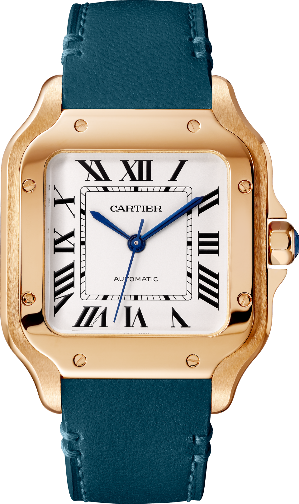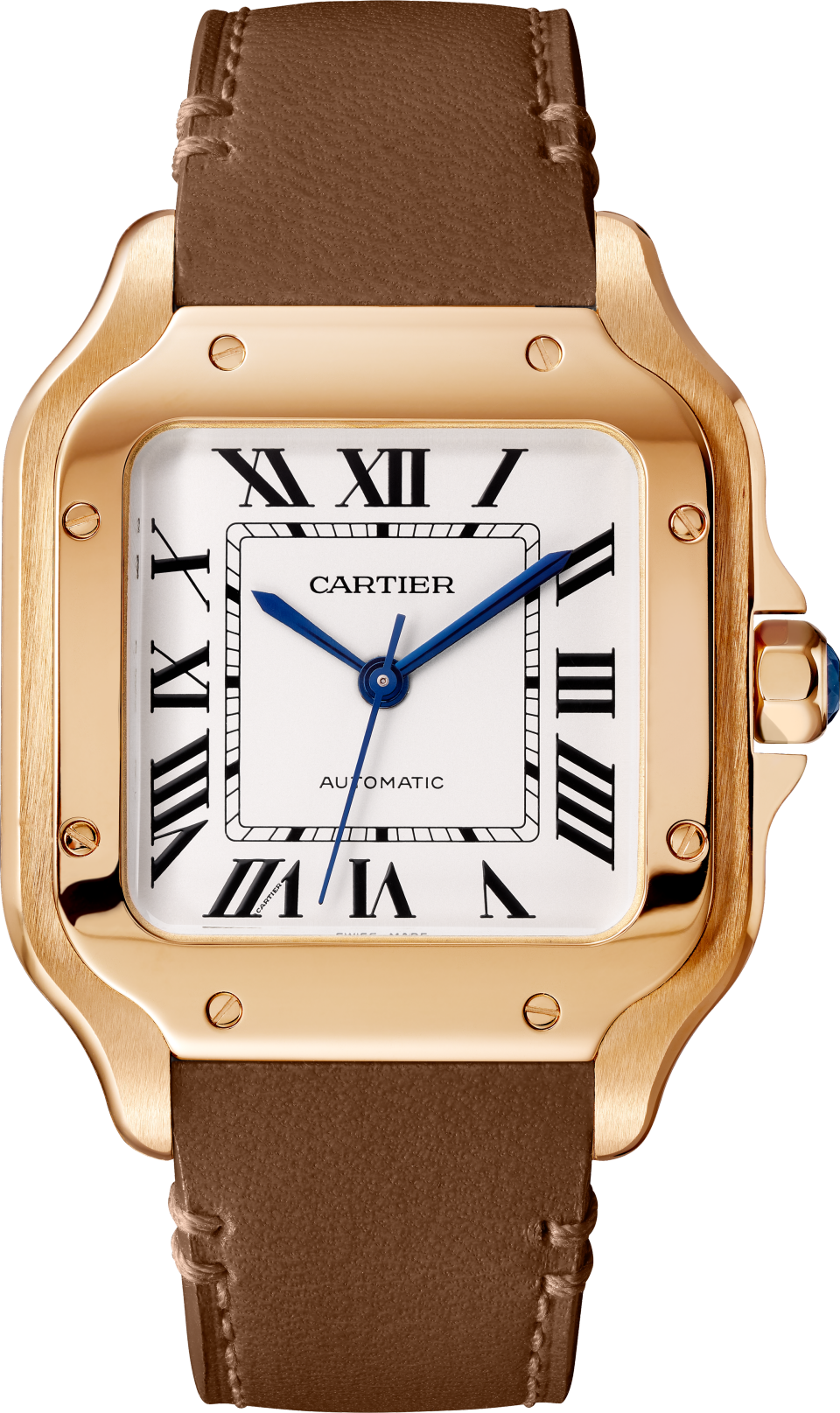 Santos watch, medium model, mechanical movement with automatic winding, caliber 1847 MC. 18K rose gold (750/1000) case, 18K rose gold (750/1000) seven-sided crown set with a faceted sapphire, silvered opaline dial, blued-steel sword-shaped hands, sapphire crystal. Two calfskin straps equipped with the “QuickSwitch” interchangeability system, double adjustable deployant buckle in 18K rose gold (750/1000). Case width: 35.1 mm, thickness: 8.83 mm. Water-resistant up to 10 bar (approx. 100 meters/330 feet).