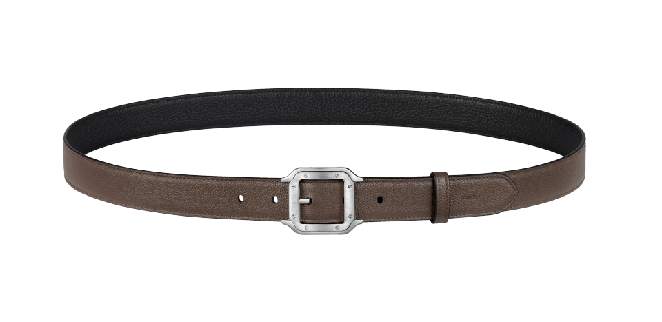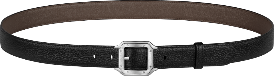 Belt with palladium-finish ardillon buckle, “Cartier” signature. Reversible grained black and pepper gray cowhide strap, embossed “Cartier” signature. Dimensions: 30 mm wide x 1,230 mm long. Adjustable