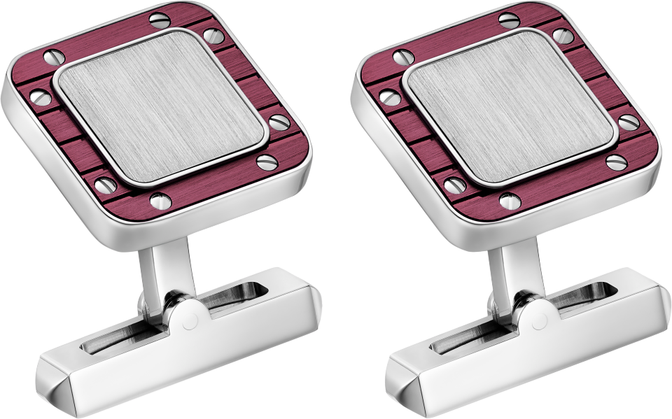 Santos de Cartier cufflinks in palladium-finish sterling silver 925/1000 and burgundy anodized striated metal.