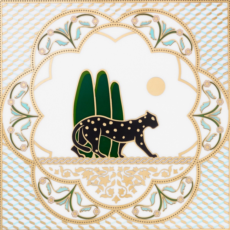 Panthère de Cartier round tray, medium model, in Limoges porcelain with arabesques motif, goat suede base. Dimensions: D 24 cm x H 2 cm