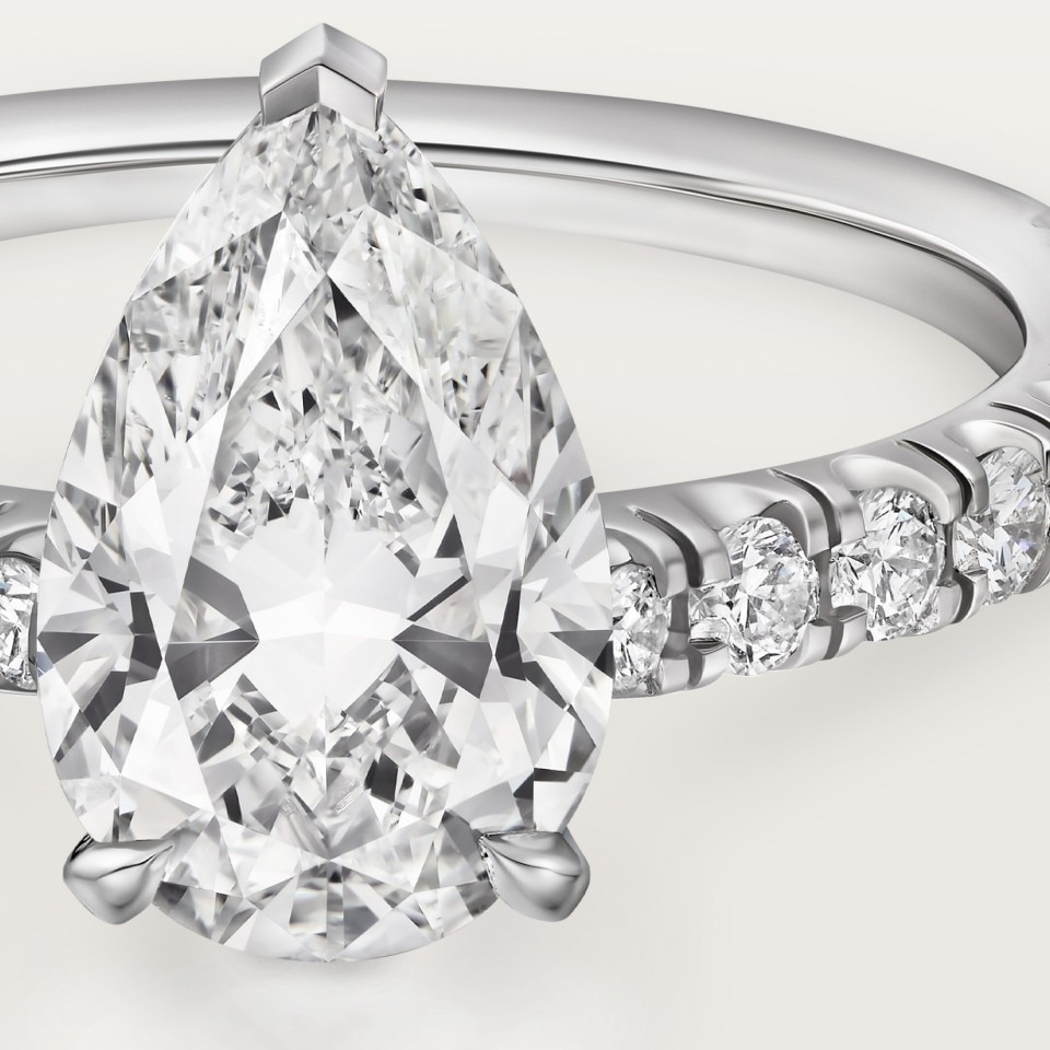 1895 solitaire, platinum 950/1000, set with a pear-shaped diamond available from 1.00 to 2.49 carats, and paved with brilliant-cut diamonds.