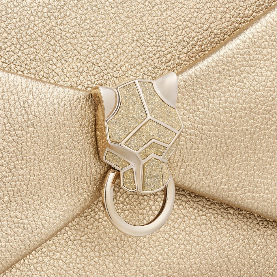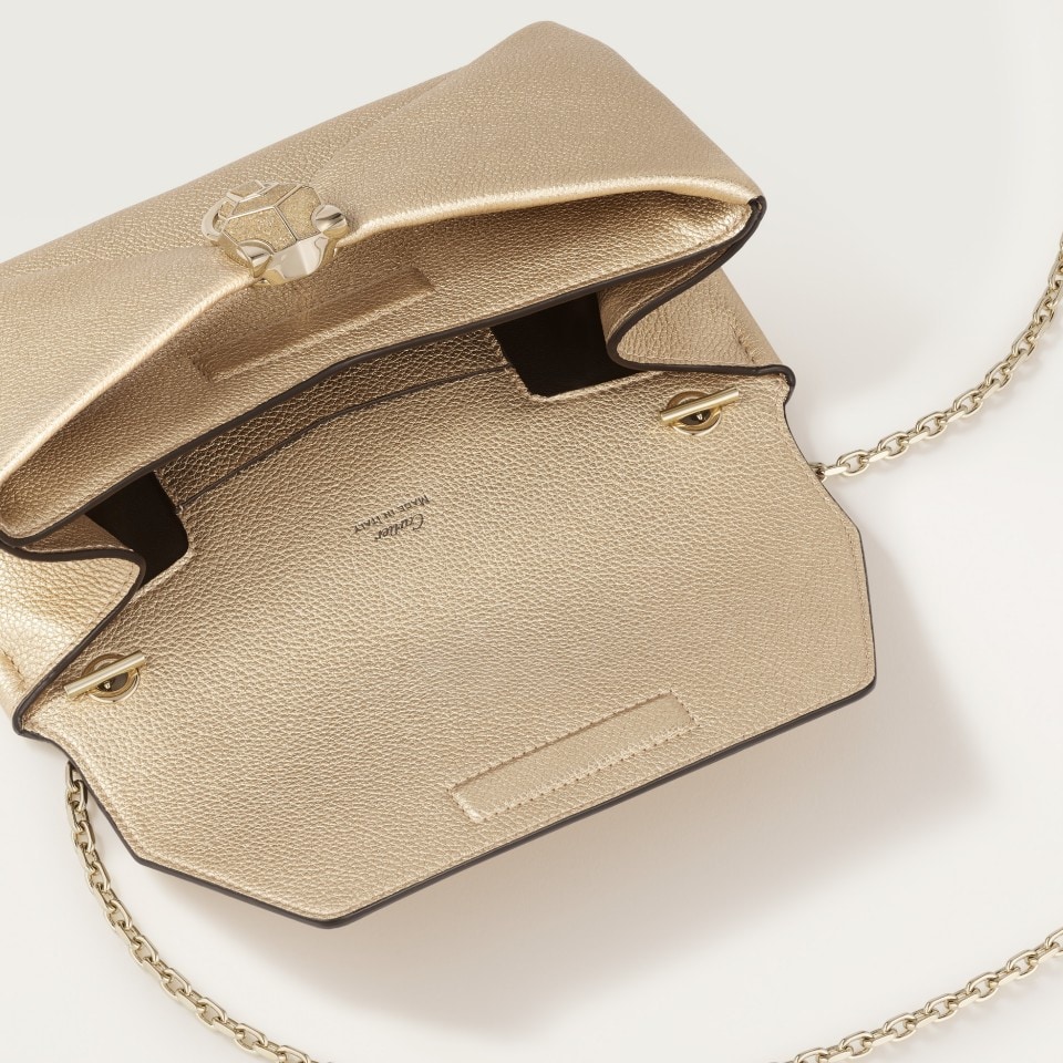Gold metallic calfskin chain pouch, golden-finish diamond-effect shiny powder clasp insert, black hot-stamped “Cartier” signature on the inside. One interior compartment, one flat pocket. One external flat pocket on the back of the bag. Lining: black lambskin. Removable chain. Dimensions: height 140 mm x length 225 mm x depth 40 mm. Hand and cross-body carry.