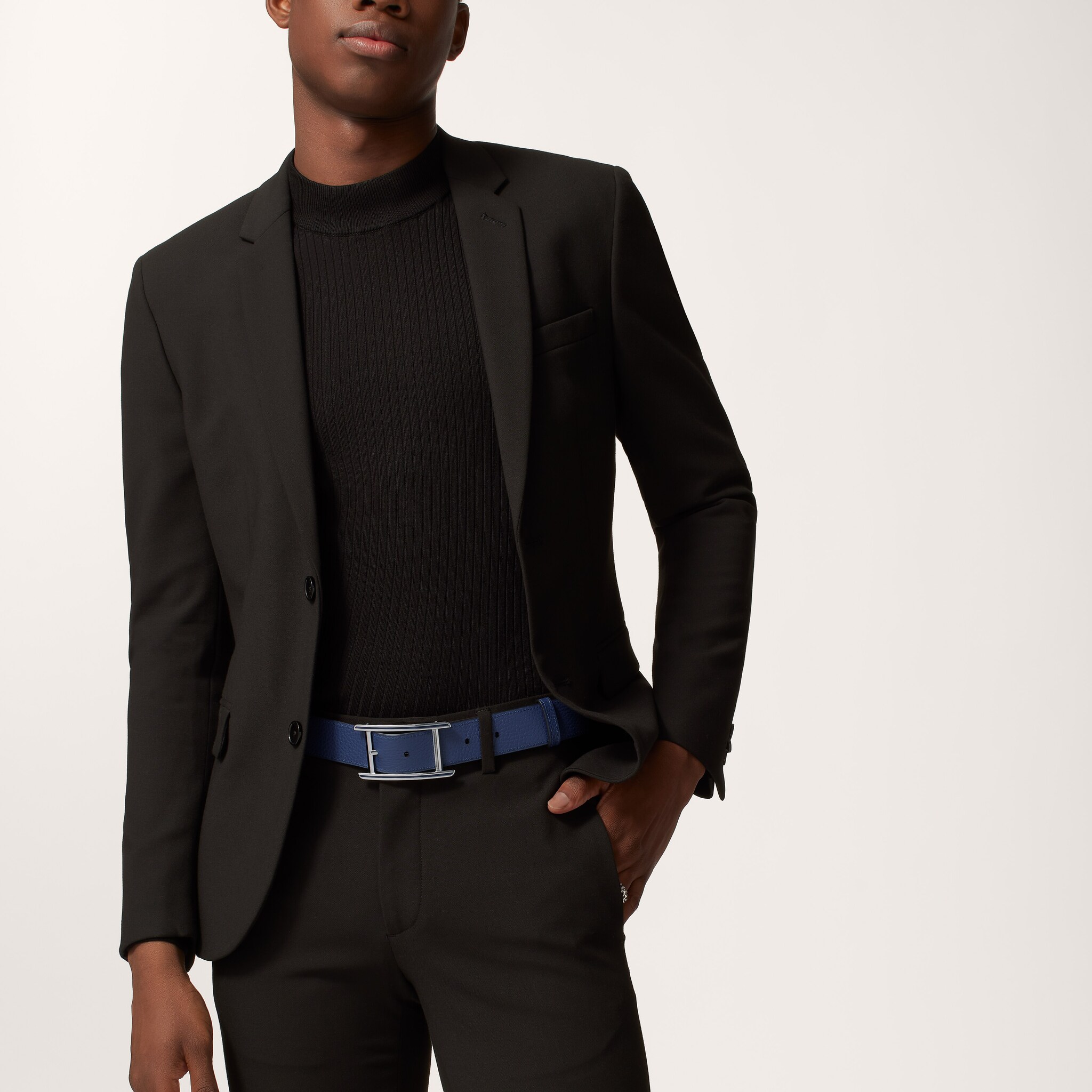 Belt with smooth gold-finish ardillon buckle, Cartier signature. Strap in black and brown cowhide, embossed "Cartier" marking. Dimensions: 35 mm wide x 1,230 mm long. Adjustable.