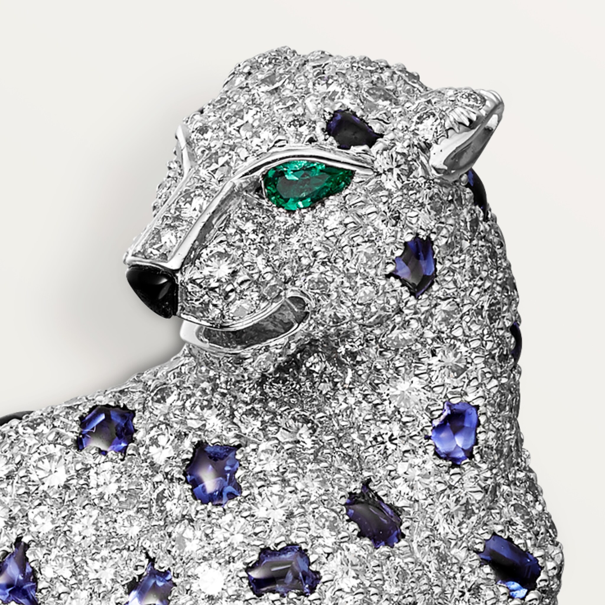 Panthère de Cartier brooch, white gold (750/1000), set with emerald eyes, onyx spots, onyx nose and 604 brilliant-cut diamonds totaling 2.88 carats.