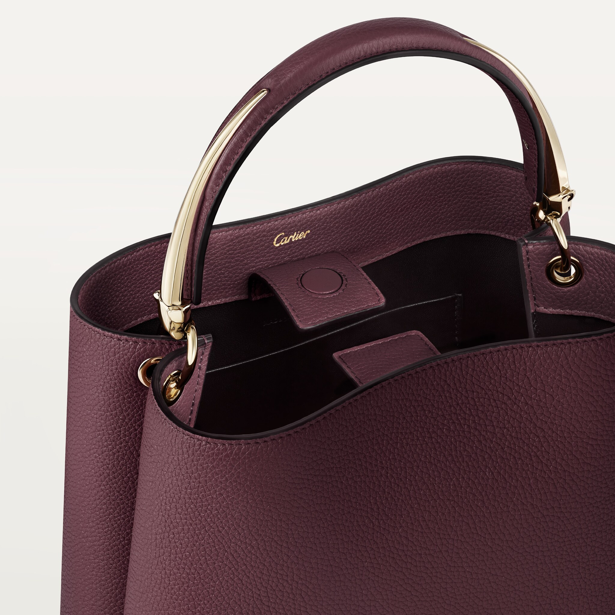 Precious and triumphant, the iconic Panthère de Cartier frames the handle of the Panthère Double bag.
