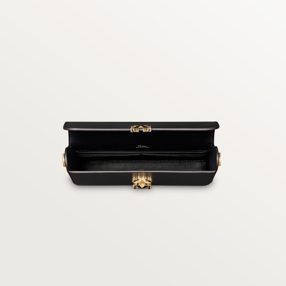 Mini model chain bag in black calfskin, golden and black enamel-finish clasp, golden embossed “Cartier” signature inside. One interior compartment, six credit card slots, one flat pocket and one signature pocket with removable mirror. Lining: black lambskin. Removable chain. Dimensions: 120 mm high x 200 mm wide x 35 mm deep. Shoulder and cross-body carry.