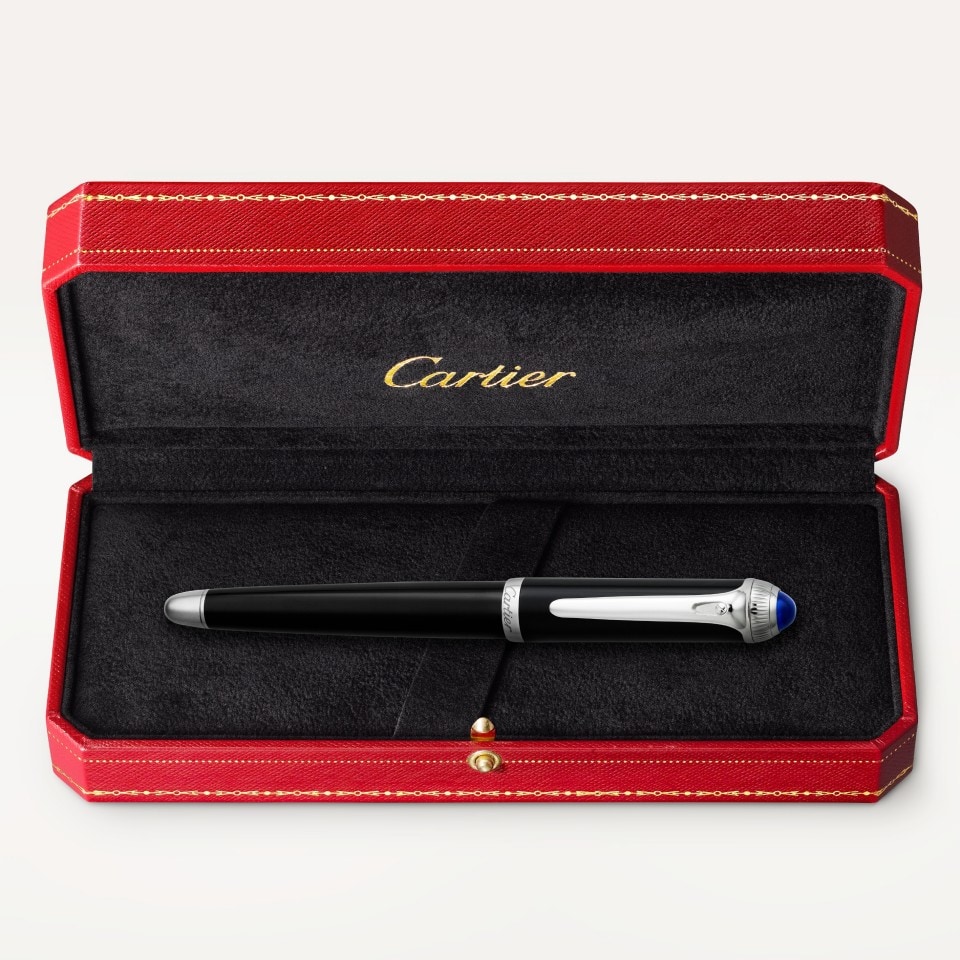 R de Cartier ballpoint pen, black composite body and cap, palladium-finish details, blue resin cabochon.