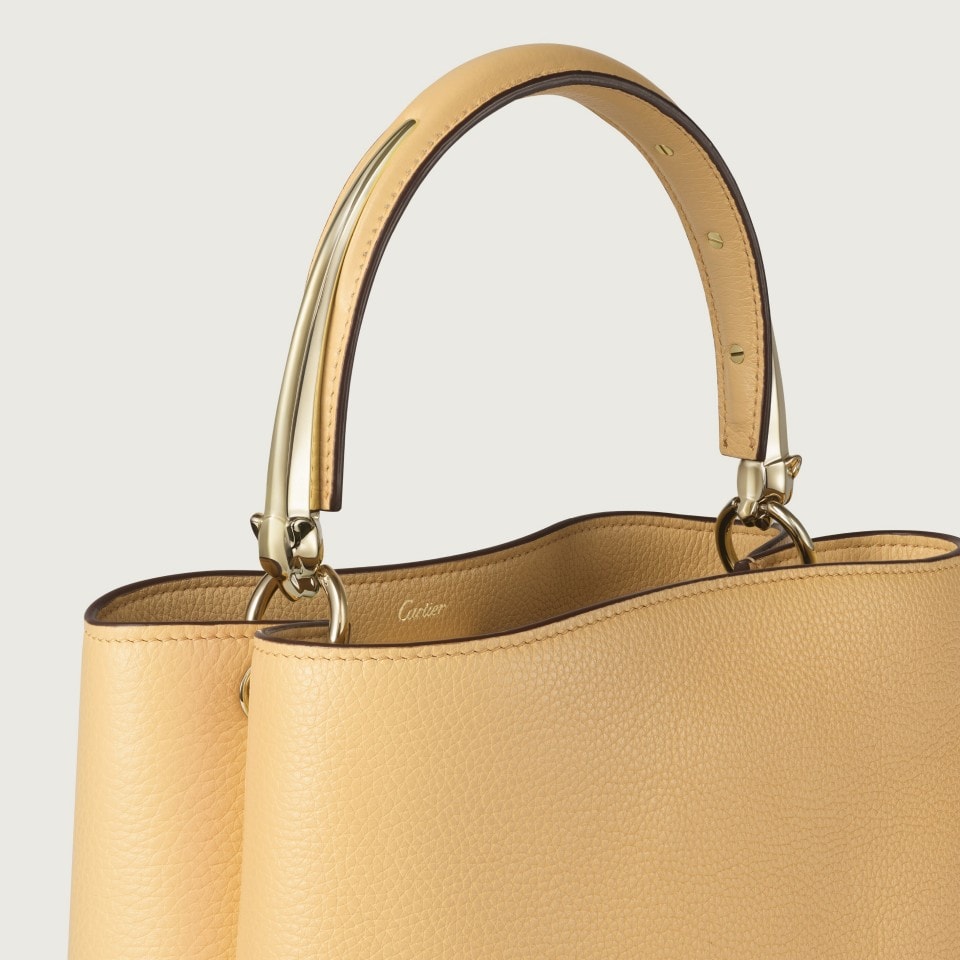 Small model handle bag in mimosa yellow grained calfskin, handle with golden-finish panther motif, golden hot-stamped “Cartier” signature on the inside. One interior compartment, one inner flat patch pocket and one removable zippered pocket in tone-on-tone grained calfskin. Magnetic closure on a mini leather flap. Adjustable and removable shoulder strap in mimosa yellow grained calfskin. Four protective metal feet. Lining: black lambskin. Dimensions: height 240 mm x length 190 mm x depth 110 mm. Hand and cross-body carry.