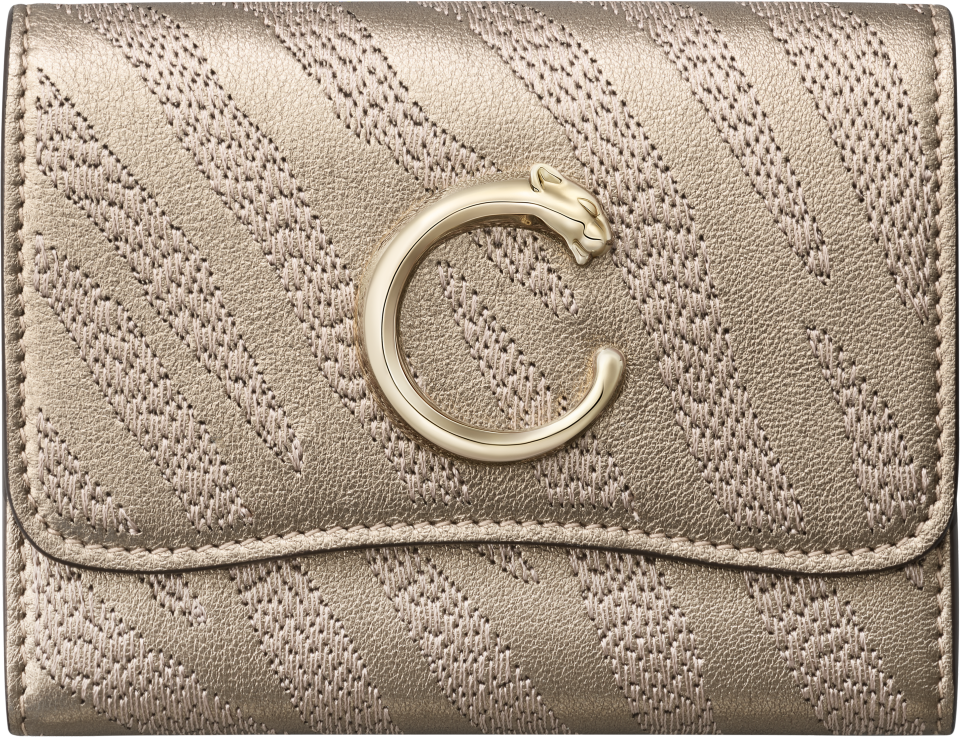 Panthère C mini wallet with golden feline embroidery on a metallic golden lambskin base, golden-finish Cartier signature logo. Interior: black lambskin, one gusset, four credit card slots, one zippered pocket, one flat pocket, golden hot-stamped “Cartier” signature. Dimensions: Width: 110 mm. Height: 85 mm.
