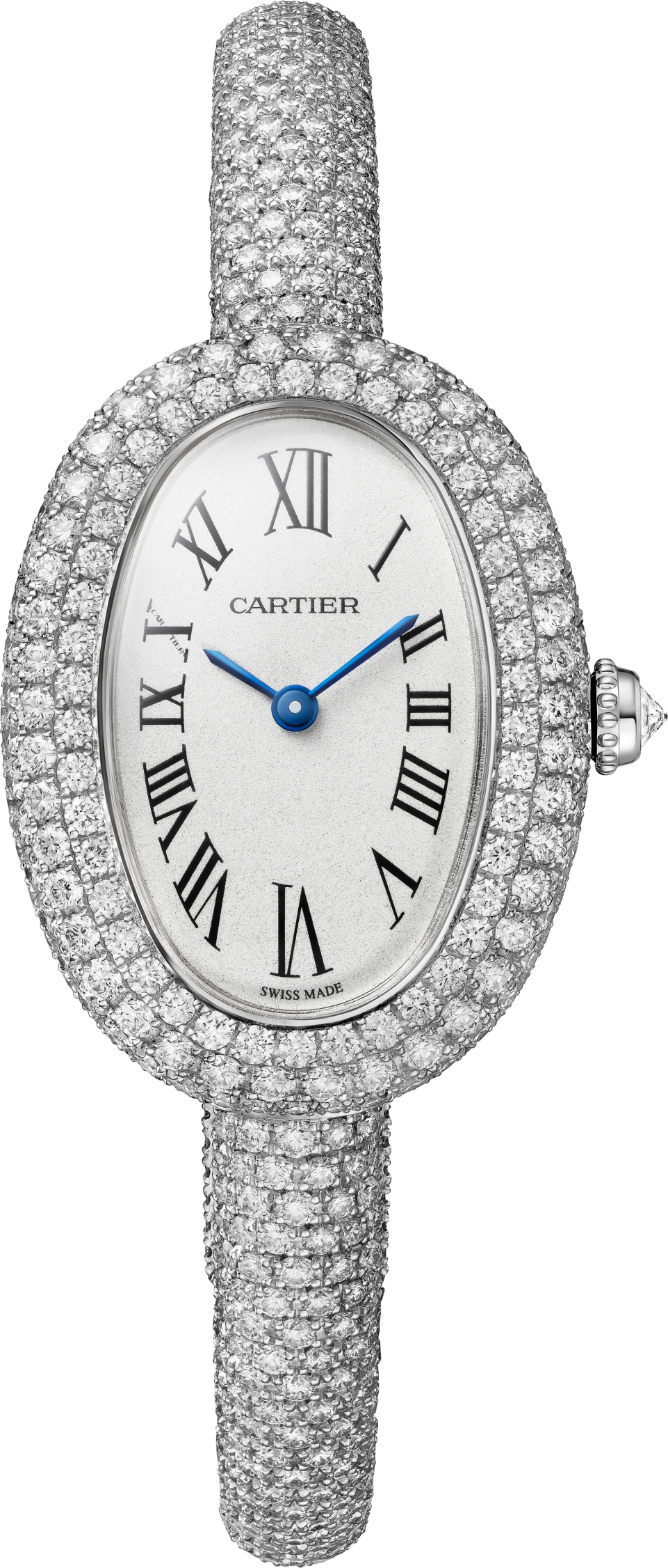Baignoire watch, small model, size 16, quartz movement. Rhodium-finish 18K white gold (750/1000) case set with 211 brilliant-cut diamonds totaling 2.69 carats. Rhodium-finish 18K white gold (750/1000) beaded crown set with a brilliant-cut diamond totaling 0.08 carats. Rhodium-finish 18K white gold (750/1000) rigid bracelet set with 436 brilliant-cut diamonds totaling 3.26 carats. Silvered grained dial, blued-steel sword-shaped hands, sapphire crystal. Length: 31.4 mm, width: 23.1 mm, thickness: 7.3 mm. Water-resistant up to 3 bar (approx. 30 meters/100 feet).