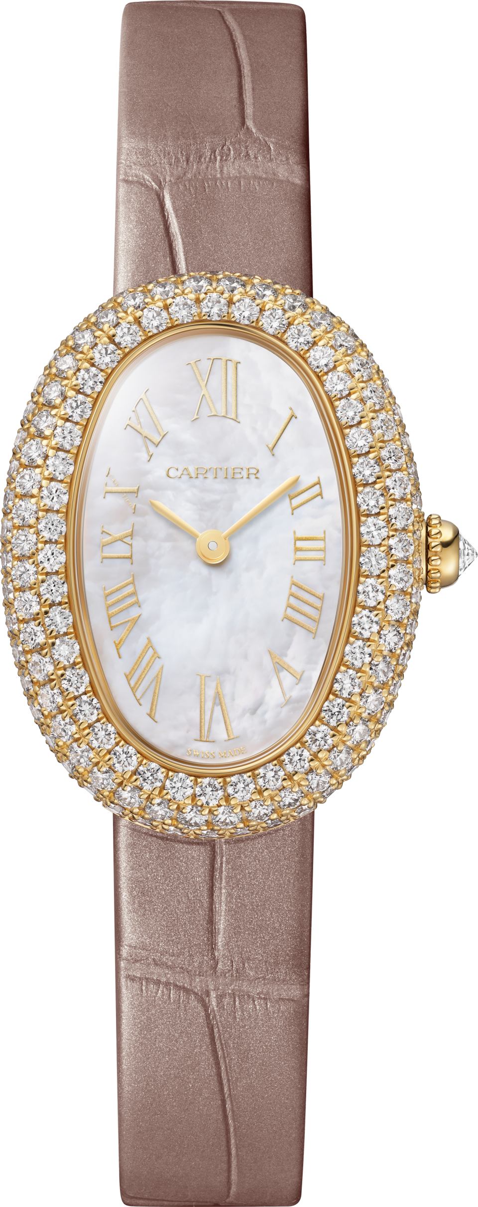 Baignoire watch, small model, quartz movement. 18K yellow gold (750/1000) case set with 227 brilliant-cut diamonds totaling 2.25 carats. 18K yellow gold (750/1000) beaded crown set with a brilliant-cut diamond totaling 0.08 carat. Mother-of-pearl dial, golden-finish steel sword-shaped hands, sapphire crystal. Semi-matte beige alligator leather strap, 18K yellow gold (750/1000) ardillon buckle. Length: 31.4, width: 23.1 mm, thickness: 6.9 mm. Water-resistant up to 3 bar (approx. 30 meters/100 feet).