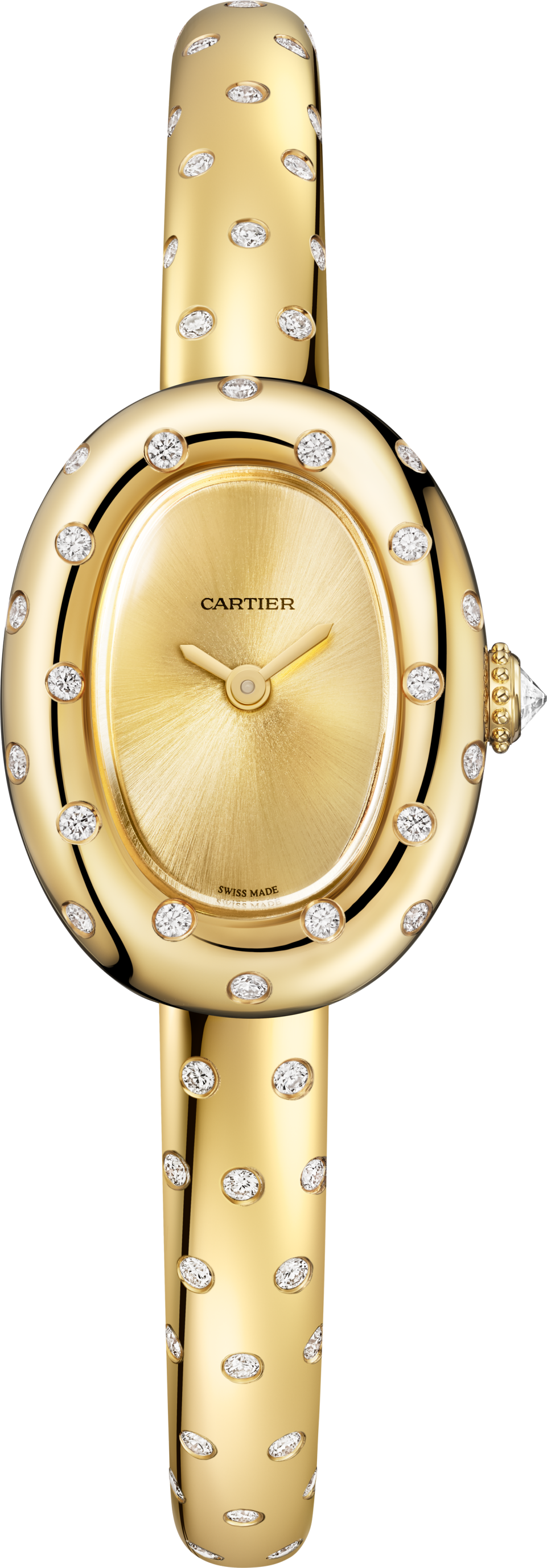 Baignoire watch, mini model, size 16, quartz movement. 18K yellow gold (750/1000) case set with 29 brilliant-cut diamonds totaling 0.29 carats. 18K yellow gold (750/1000) beaded crown set with a brilliant-cut diamond totaling 0.07 carats. 18K yellow gold (750/1000) rigid bracelet, set with 46 brilliant-cut diamonds totaling 0.45 carats. Golden dial, golden-finish steel sword-shaped hands, sapphire crystal. Length: 24.6 mm, width: 18.7 mm, thickness: 7.2 mm. Water-resistant up to 3 bar (approx. 30 meters/100 feet).