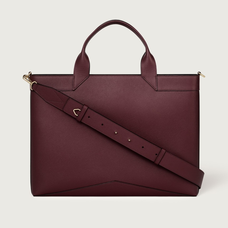 Slim Cartier Losange document holder in burgundy grained calfskin. Exterior: zipped closure, metal parts in golden finish and enamel. Interior: black textile lining with gold-colored "Cartier" signature, one zipped pocket, one compartment. Dimensions: height 280 mm x width 370 mm x depth 40 mm. Hand and shoulder carry with adjustable and detachable strap.