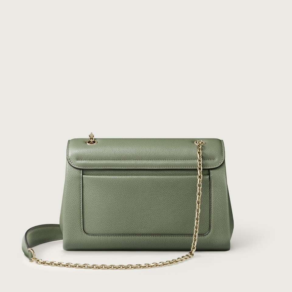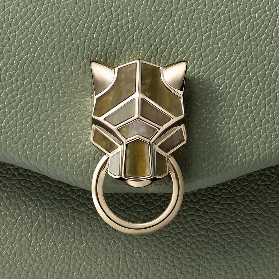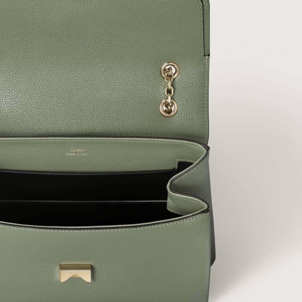 Panthère de Cartier small model chain bag in sage green grained calfskin, marble-effect clasp with golden-finish, golden hot-stamped “Cartier” signature on the inside. Two interior compartments, one flat pocket and one signature pocket with removable mirror. One pocket on the back. Lining: black lambskin. Dimensions: height 160 mm x length 235 mm x depth 105 mm. Shoulder and cross-body carry.