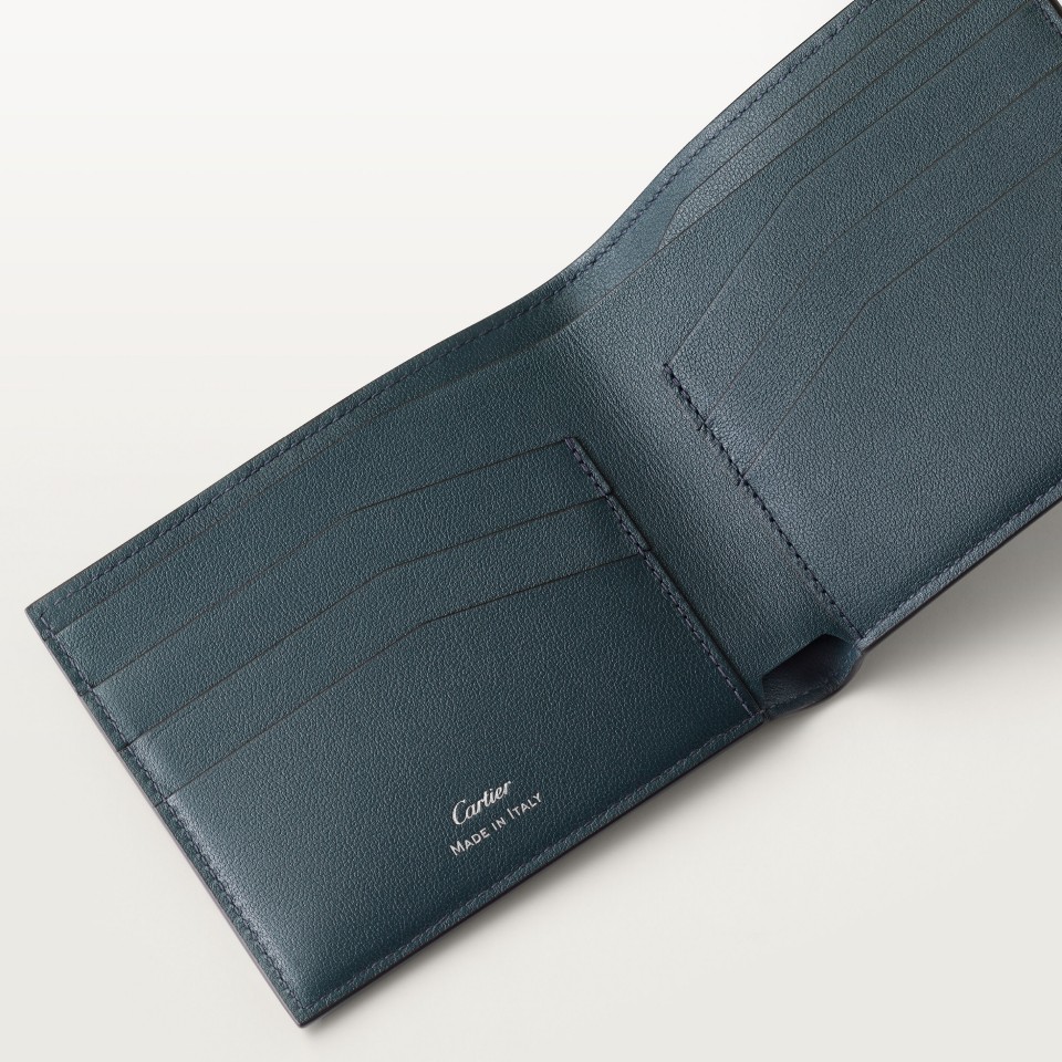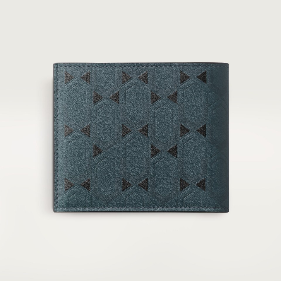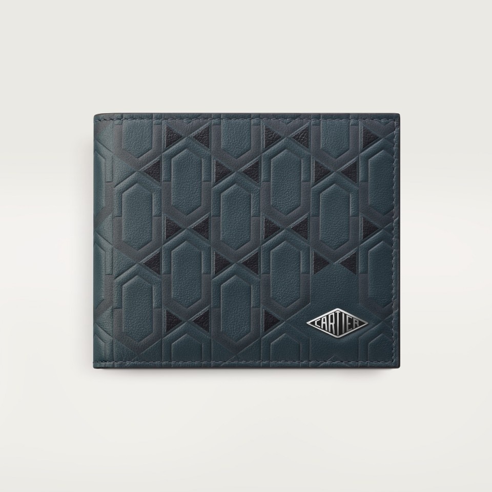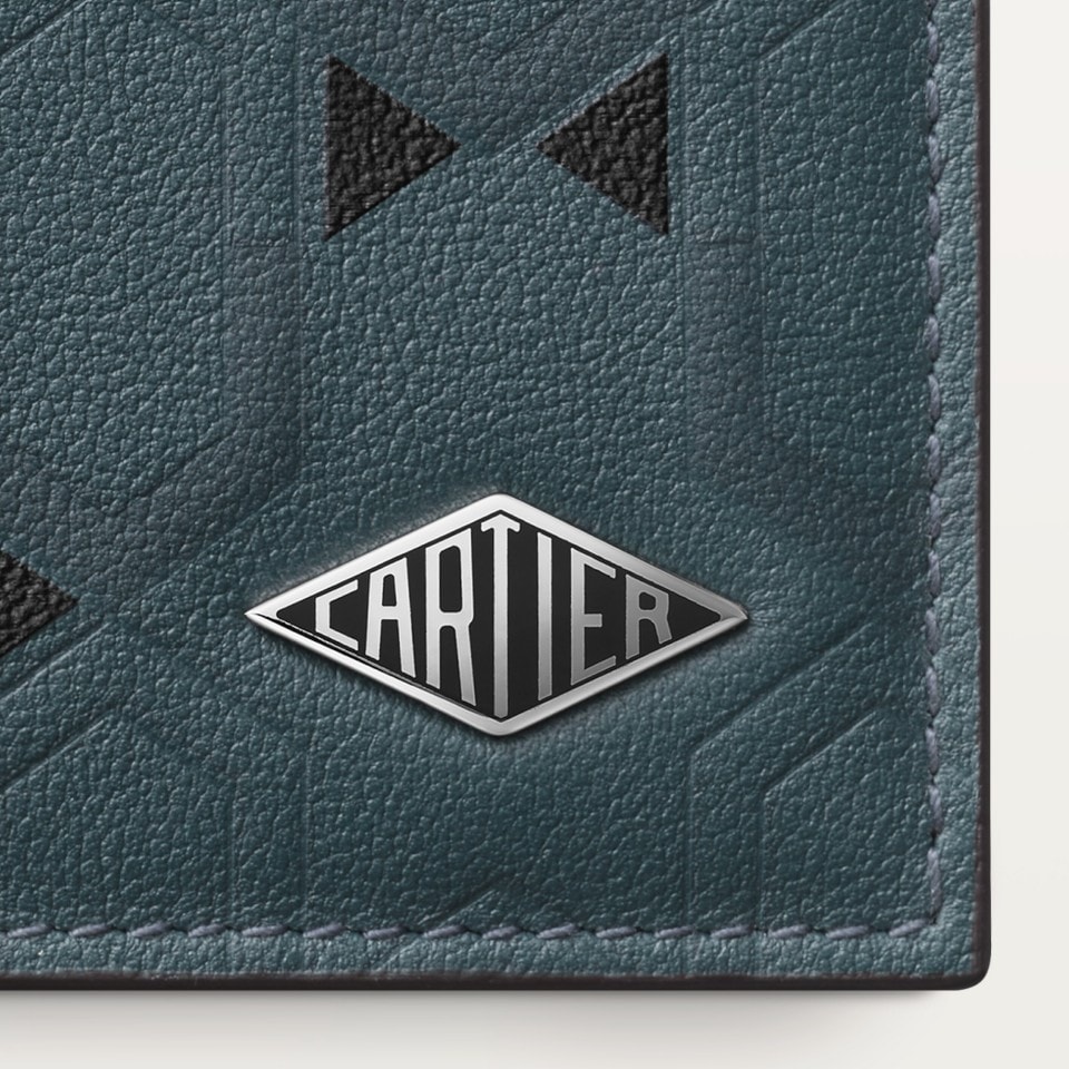 Cartier Losange 6-credit card wallet exclusive to the Middle East, in grained calfskin with arabesque graphite print, palladium finish and black enamel. Exterior: Cartier Losange logo. Interior: grained graphite calfskin, 6 credit card slots, 2 banknote pockets. Dimensions: height 90 mm x width 120 mm.