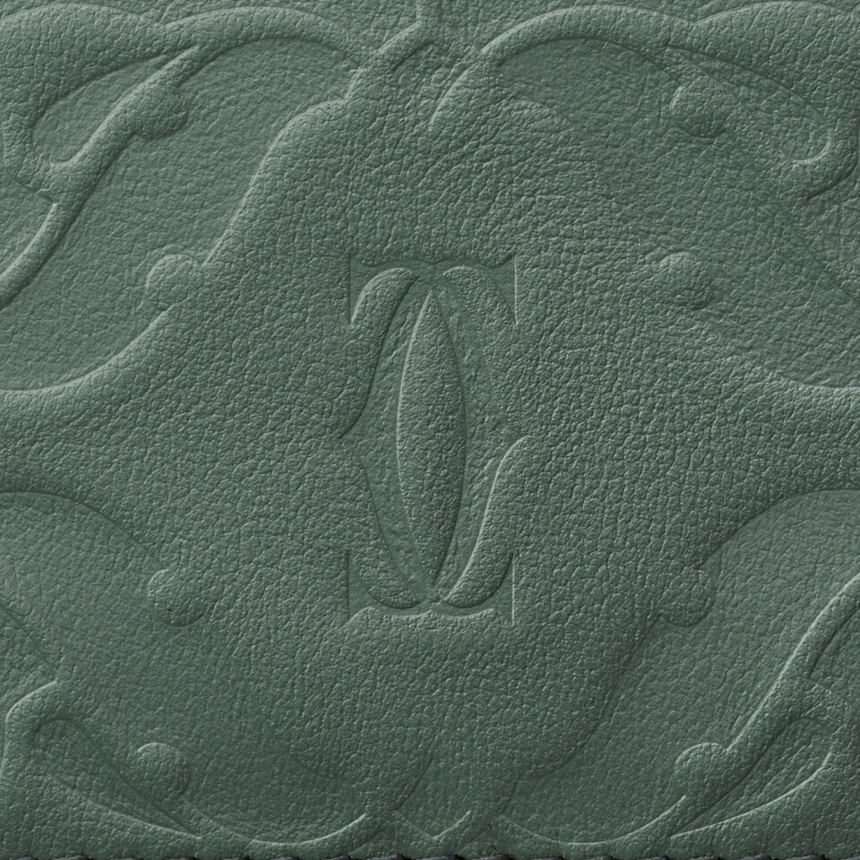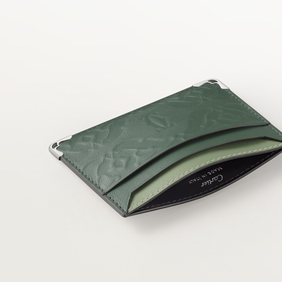 Must de Cartier double card holder in khaki calfskin embossed with a floral motif. Exterior: embossed Double C logo, palladium-finish metal corners. Interior: green calfskin, Cartier logo, two flat credit card pockets on the front and two pockets on the back, central pocket. Dimensions: height 105 mm x width 75 mm.