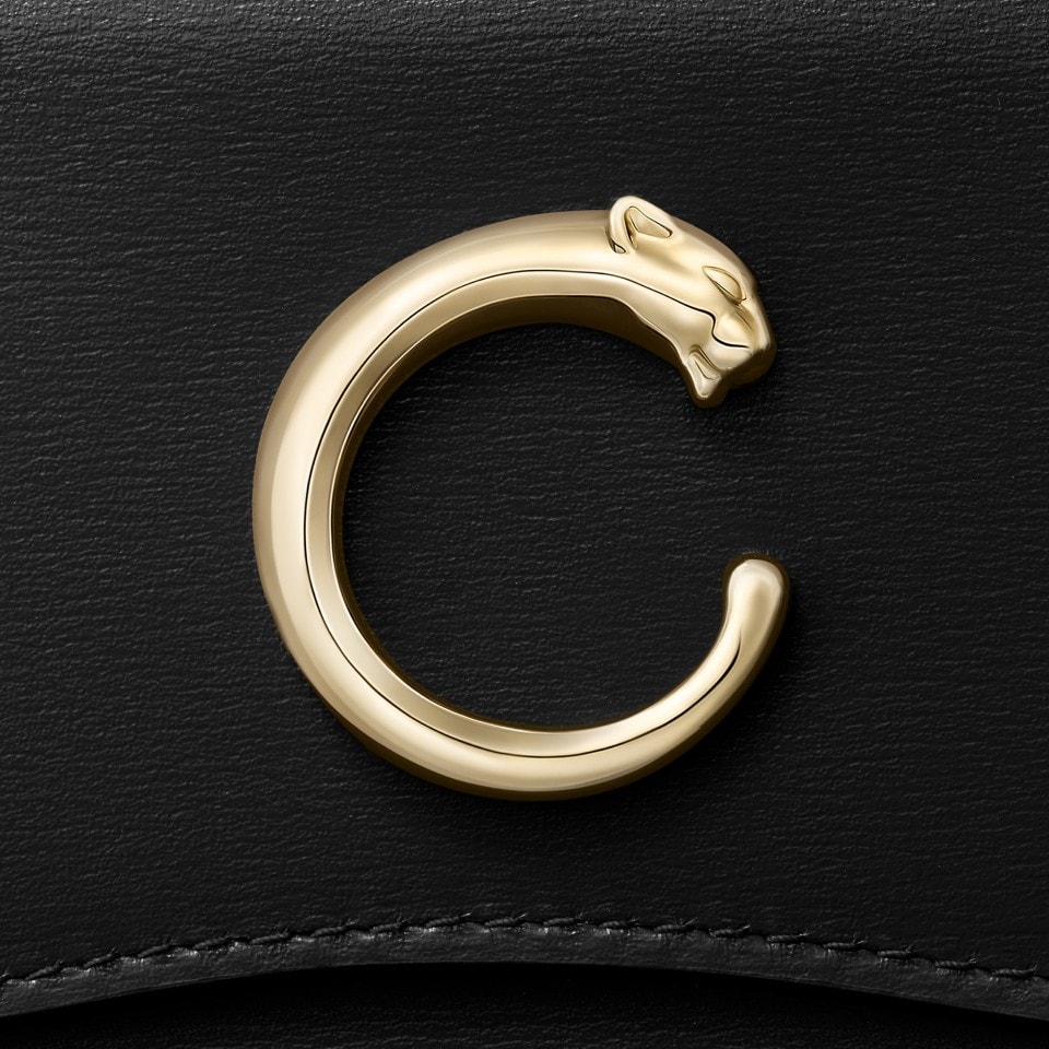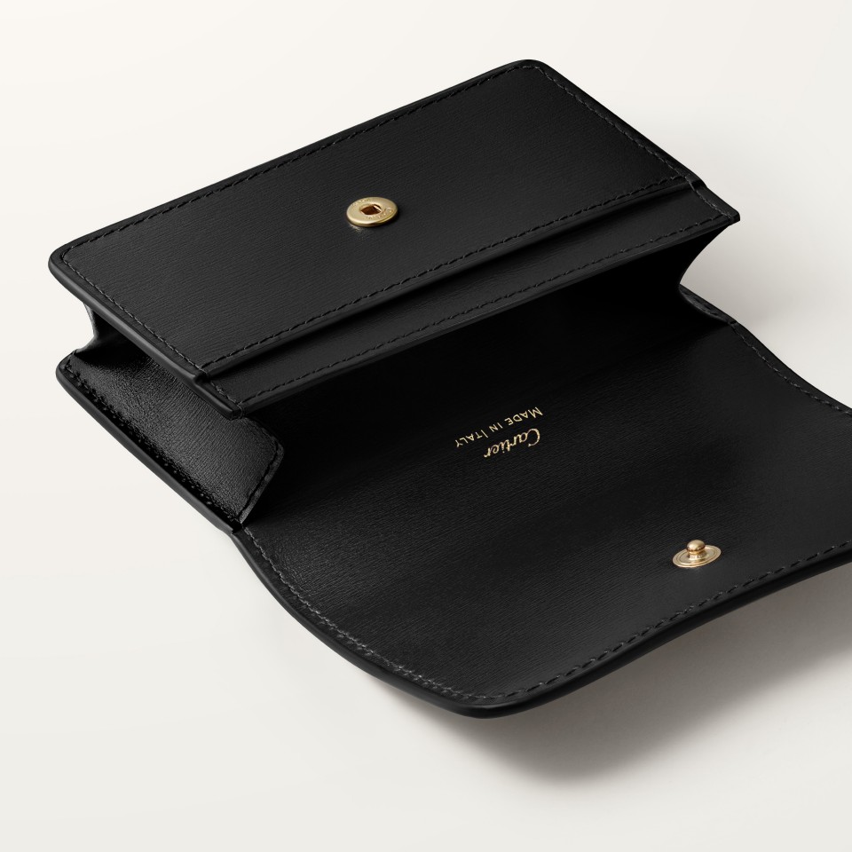 Business card holder, Panthère C, black calfskin, golden-finish Panthère logo. Exterior: One flat pocket at the back. Interior: black lambskin, one gusseted compartment, one flat pocket, golden hot-stamped “Cartier” signature. Dimensions: Width: 110 mm. Height: 75 mm. Length: 25 mm.